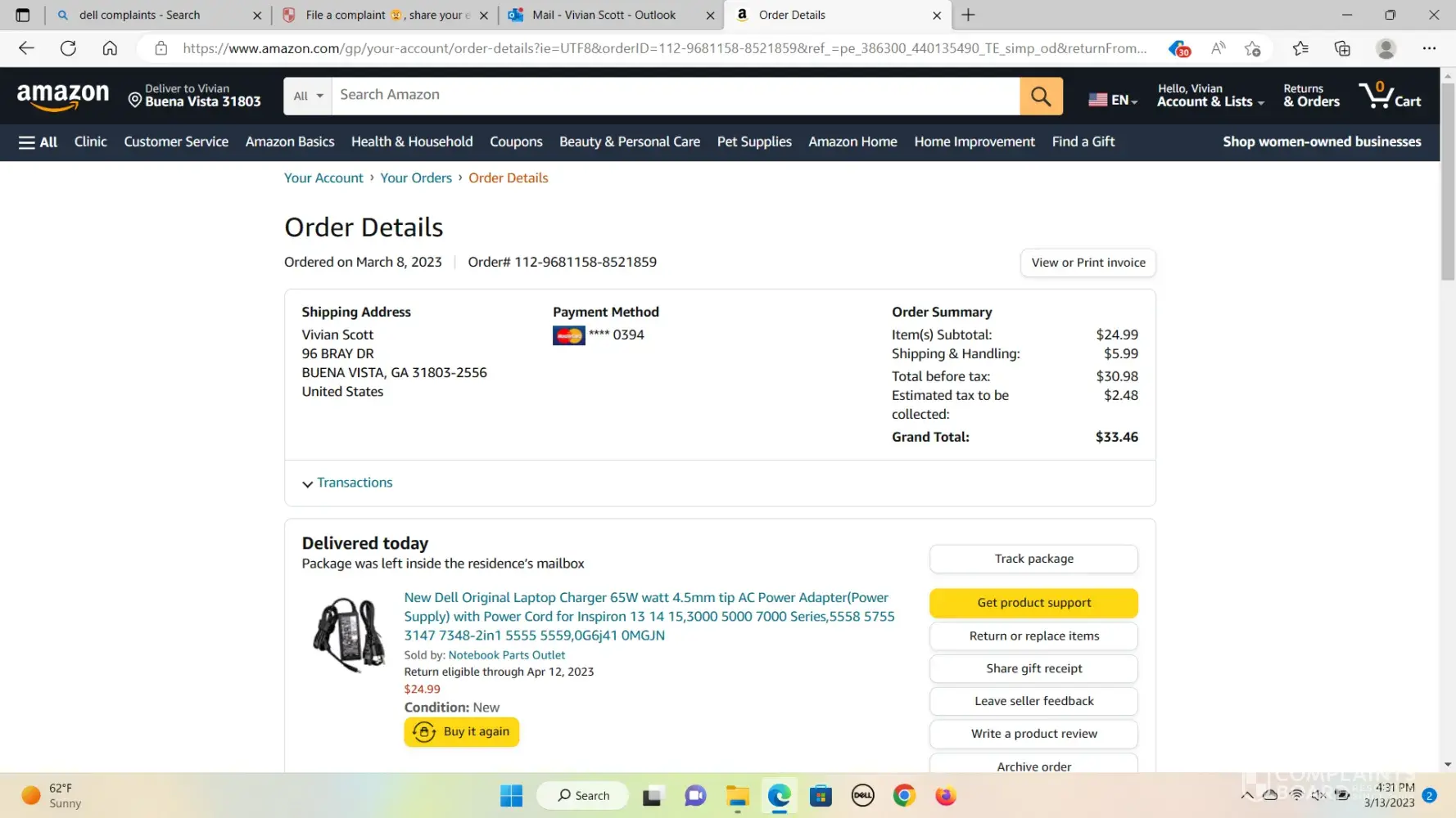 Desired outcome: I want Dell to admit they sent the wrong sized adapter, and refund my $33.46 I paid to Amazon for the correct sized adapter. I would also like an apology for them sending the wrong adapter.