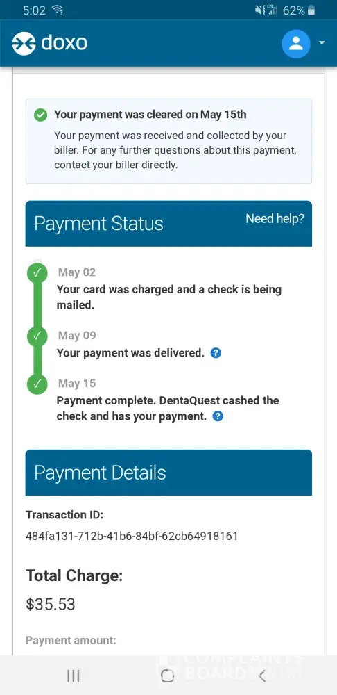 Paid Denta Ouest a payment of 35.00 was supposed to be Denta Trust. Someone from Denta Ouest cashed the check knowing that I Barbara Mayes do not have a plan thru Denta Quest. I am asking for a full refund because I don't have insurance from your company . Everyone makes a mistake and I did on this.