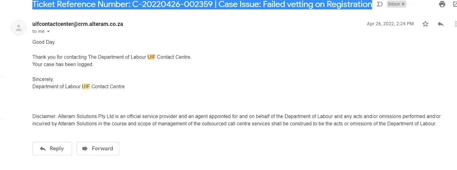 On the 21 April 2022 I registered on the Department of Labour website for UIF filling. I could not login as I failed the vetting process because the name of my previous employer was in Afrikaans and could not recognize it.