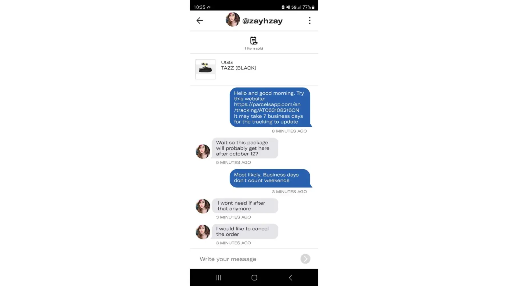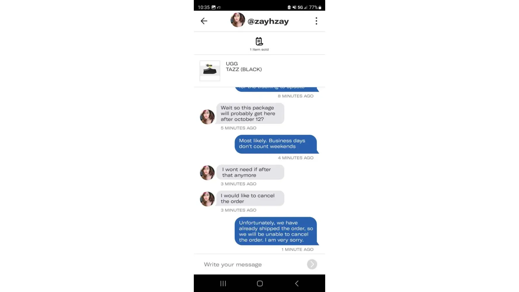 A Buyer, Zai Zayster reached out to me on the sale of an item called the UGG TAZZ Black. I shipped the item to the buyer. It takes 3-5 business days to ship items to customers, and it may take 7-14 business days for the item to arrive. We made an exception for the buyer, and shipped the item within 2-3 days. This was all communicated to the buyer. The buyer agreed to this 9/30/2023. Today, 10/5/2023, the buyer inquired about the item, and if it will be delivered by 10/12/2023. We explained to the buyer that it may not be possible since it may take 7-14 business days (excluding weekends) to deliver. The buyer A Buyer, Zai Zayster reached out to me on the sale of an item called the UGG TAZZ Black. I shipped the item to the buyer. It takes 3-5 business days to ship items to customers, and it may take 7-14 business days for the item to arrive. We made an exception for the buyer, and shipped the item within 2-3 days. This was all communicated to the buyer. The buyer agreed to this 9/30/2023. Today, 10/5/2023, the buyer inquired about the item, and if it will be delivered by 10/12/2023. We explained to the buyer that it may not be possible since it may take 7-14 business days (excluding weekends) to deliver. The buyer then wanted to cancel the order, which is impossible since the order has been shipped and is in transit (Tracking Number AT063108216CN). The buyer then creates a dispute with Depop under "ITEM NOT RECEIVED). I respond to the case immediately saying I disagree with the case, and that the item is in transit, and the tracking number is already uploaded on Depop for both the buyer and Depop to see. The case was escalated quickly and resolved within minutes, in which the buyer was refunded from my account. The buyer @zayhzay now gets to keep both the item and the money, which is a scam. I told Depop about this fact, and that I provided all tracking information and told the buyer about the shipping time, but then a Depop Rep named Wrench, said that I have to go and ask the buyer for the money back or a return on the item when it arrives to them. That means they know the buyer will receive the item. I then asked the buyer for the item back when it arrives, but they are no longer responding. This means they know they have scammed me, and now want to dodge accountability. Prior to this, I had a similar case, in which the case was decided in my favor. And I was told in an email (picture uploaded) by a Depop Rep named Dolores G, that as long as I upload trackable information, Depop will close disputes in my favor. All I want is my money back and an apology from Depop.