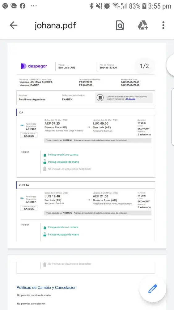 On February 13, 2020 we bought online a flight to Cordoba, Argentina. We supposed to flight on March 18, 2020. Just the the issues began with the covid-19 and many countries including Argentina locked up the borders. We called to the number that was in the website [protected] and talked to Jose Romero. He suggested us to changed the flight's date, and so we did.