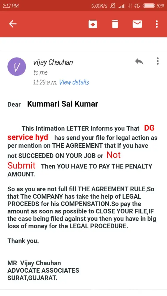 I have started my work from dg services on 3rd September and my submission couldnt happen because it is fraud company I stopped work. Now they are demanding money of 7500 by today evening 4o clock and if I donot pay them they will file the case and make me pay around 50000... They called and are threatening me with these things... Please do something and resolve my issue I need help... If I have money I wouldnt do such jobs... I cannot pay now and it is a fraud company. So please kindly help me anyone.