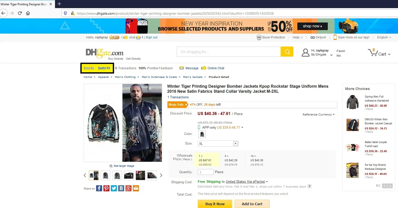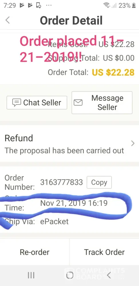 I placed an order for a bomber jacket thru dhgate.com on 01/02/20 for the total amount of $ 46.71. On 01/08/20 I was checking the shipment status of my order and saw a message associated with my order that says "sold out" (see attachment 1 entitled order detail with comments) which clearly shows the item is in stock in china and available. You can still place an order for it however if it is not in stock I don't understand why they would still be taking orders and money for it.