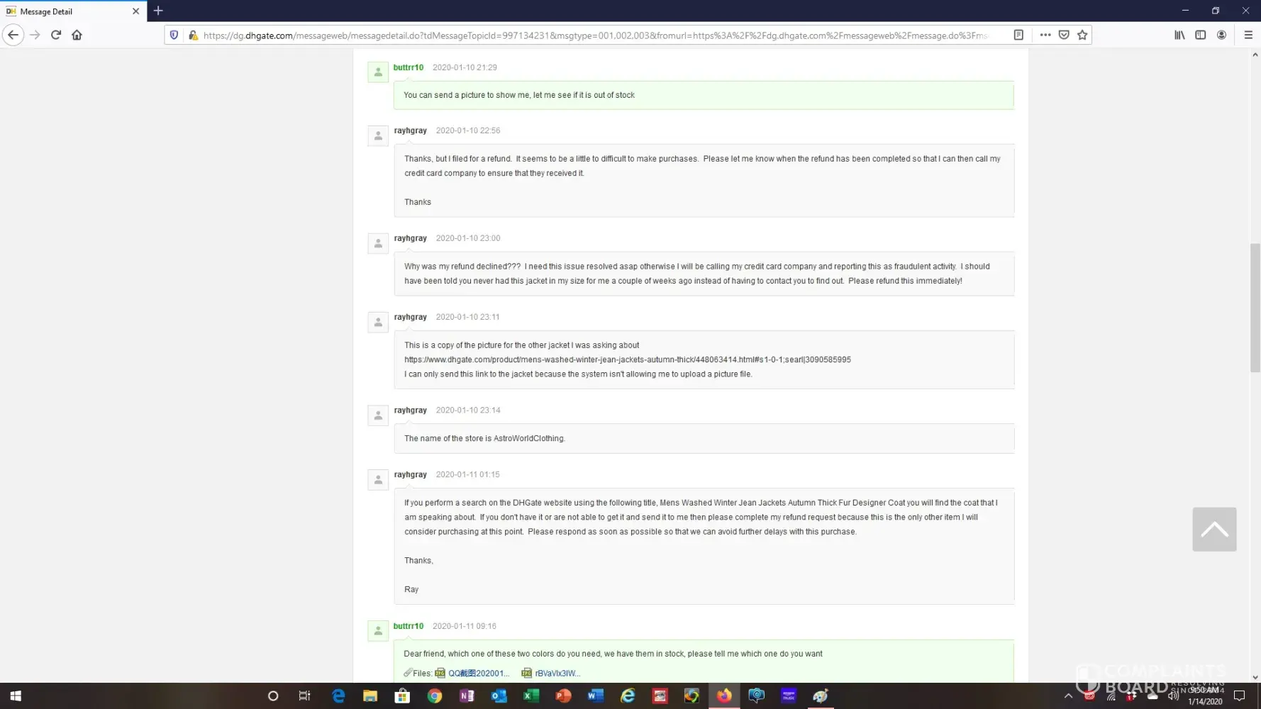 I then messaged the seller and they informed me that I should file for a refund which I did. (see attachments entitled message history re bomber jacket).