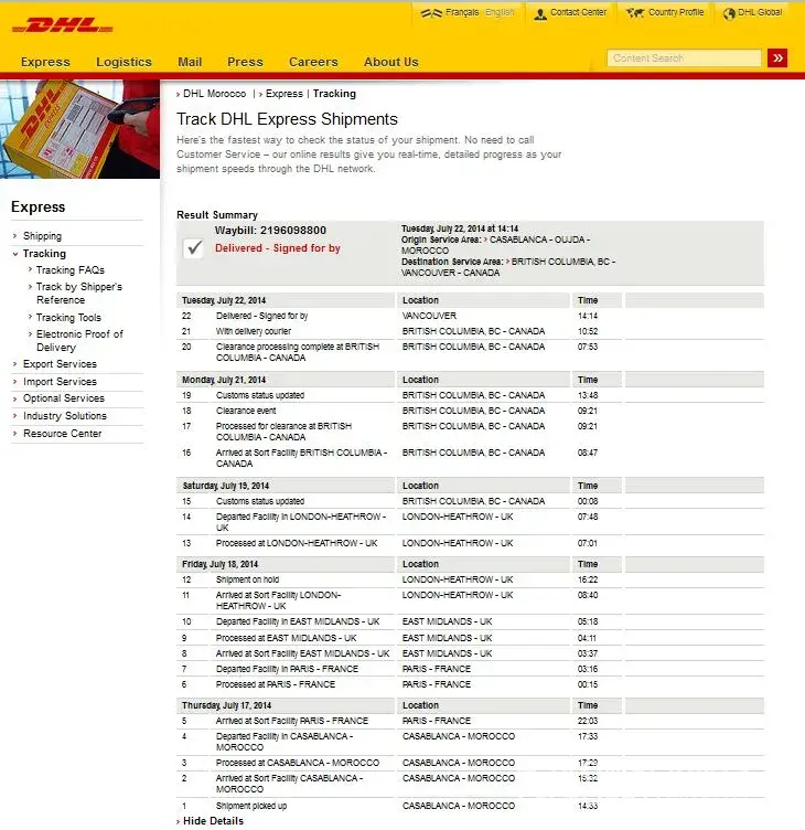 Worthless Company. Ship by any other means. Even the Post Office can track your parcel - but not DHL! And they have no Customer Service. Try to get through and you will end up spending all afternoon talking to computer answering systems. They don't reply to emails. If you are lucky ... after a few weeks ... they might direct you to a call center so you can waste your time talking to a untrained and useless rep who has no more idea than you do where your shipment is and no powers to fix the problem. She will tell you the usual lies again tho.. if that helps.