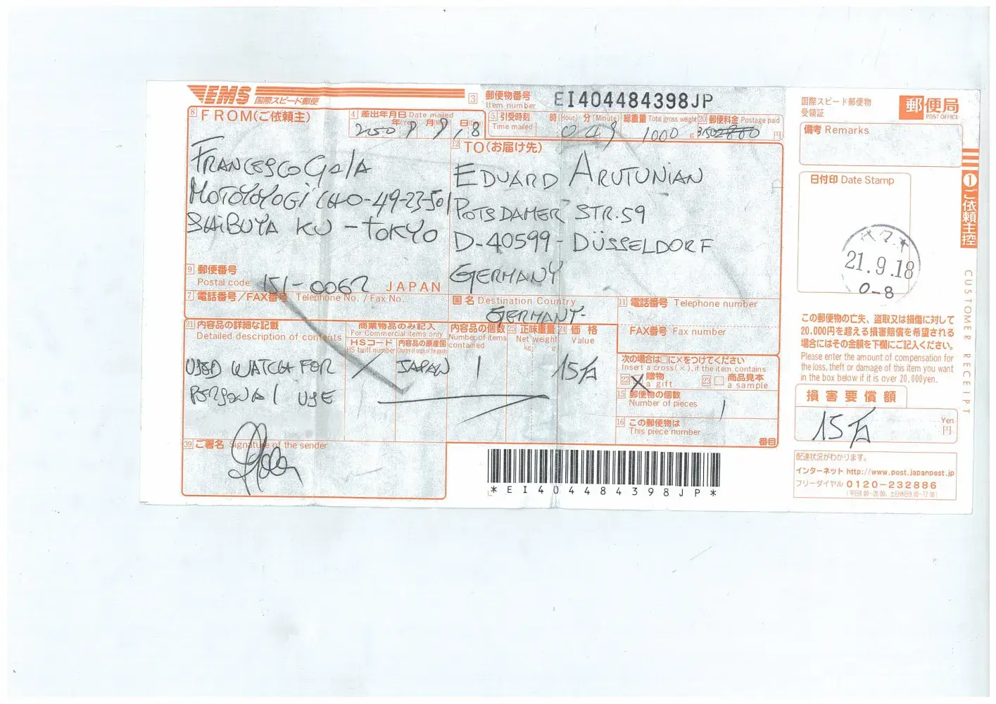 A wristwatch was delivered to a buyer in germany in september 18th.After 2 months the buyer complaint as the watch has not been delivered as well the DHL sent to the Japanese post a declaration of delivery on september 29th but not listed on the tracking page.