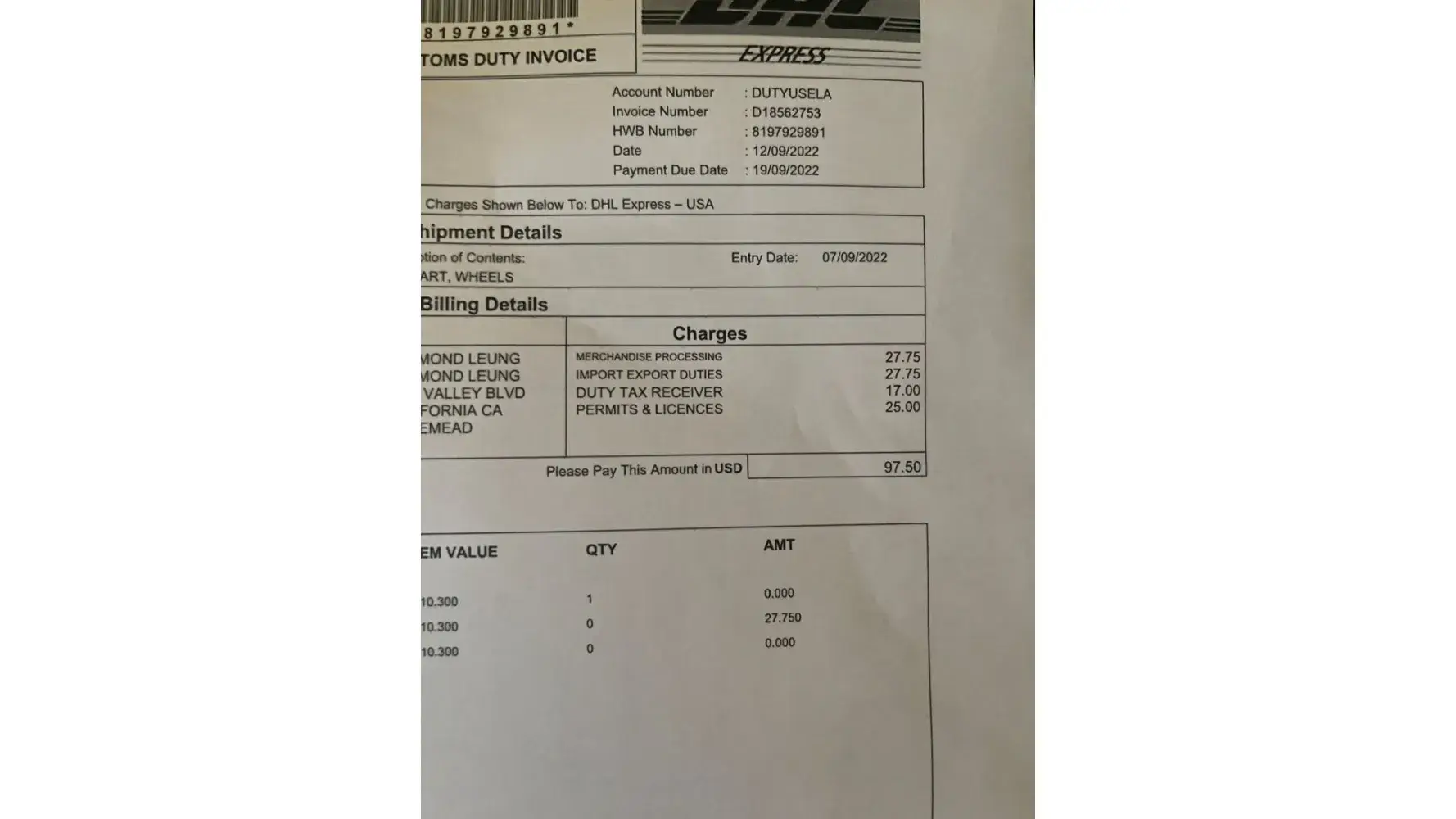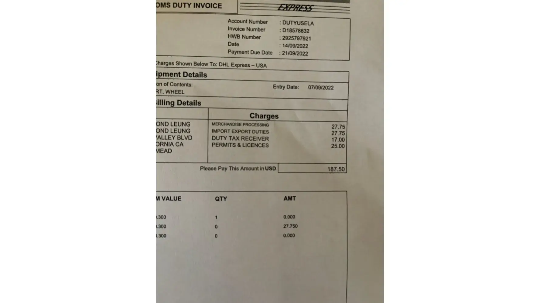 2nd shipment I got a duty fee for a total of $187.50 and I was charged $90 more. I saw the break down on each fee and it came out to be $97.50 which is the same as the first shipment. So I like to know where is the breakdown for that $90 charge? I called DHL and they routed me to the Clearance Department and was left with an automated voice message. I left a message and did not hear a response from them. I might have a feeling that I might be overcharged overall on my duty fee
