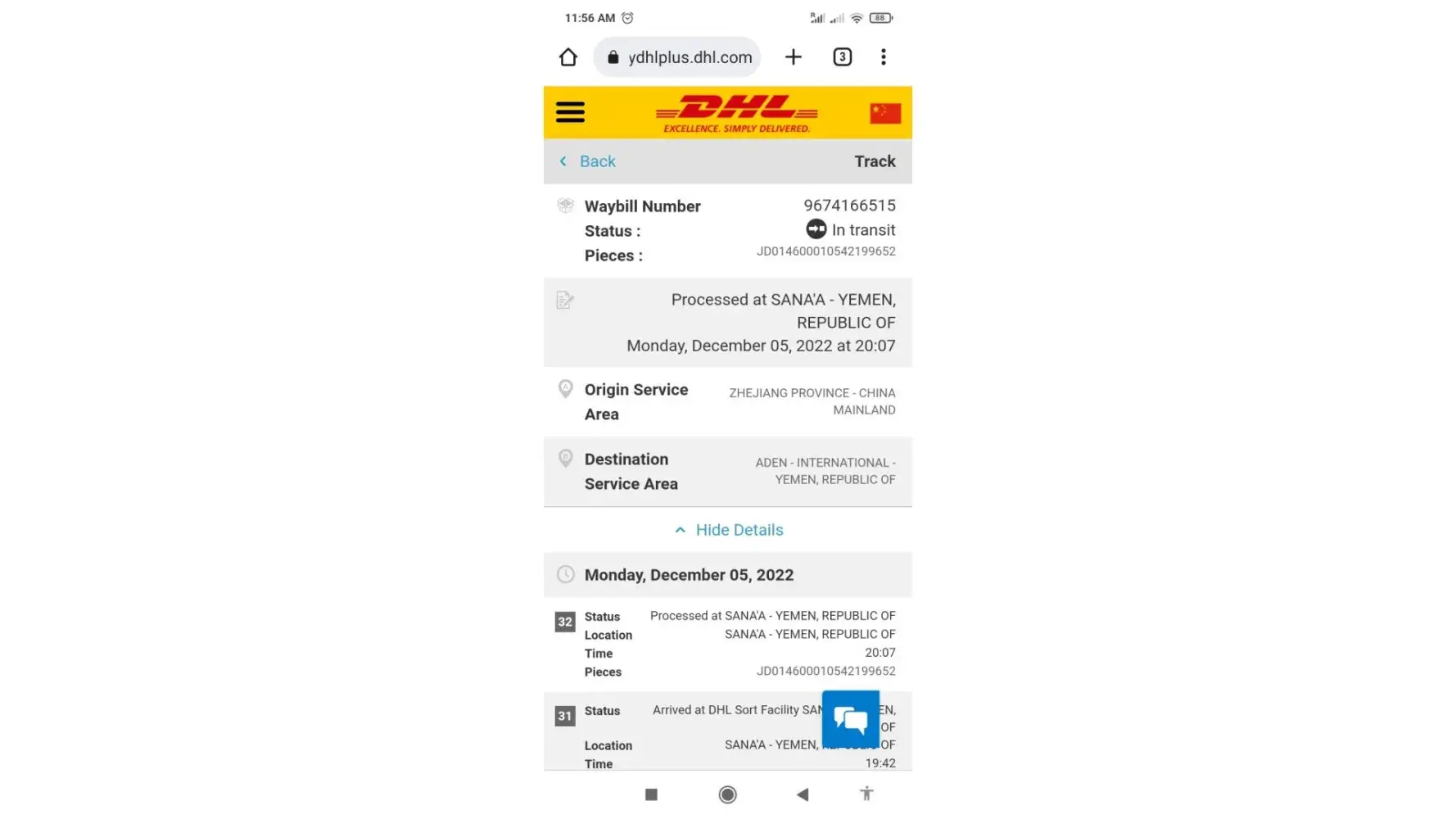 I have a document sent from China a destination to Yemen city of Aden. Everything was fine till it reached Amman Jordon. It stayed there as transit for more than 10 days then in DHL Yemen office 4 days and is still at Sana'a - Yemen DHL office. This is not an express service anymore. The documents contains shipment clearance for the customs and I have to pay fine for late declaration. It is the worst service I experienced in my business career. No more DHL.