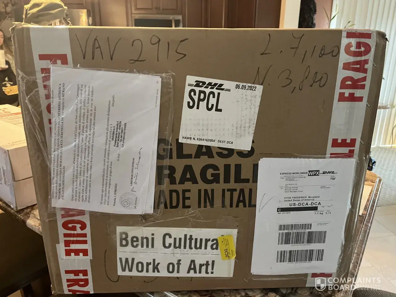 On Sept 12, 2022 we had a package delivered from DHL. The driver stood at the stairs and threw the package onto the porch. This package was clearly marked Fragile Glass and Beni Cultural Work of Art (See Photos). This piece of custom glass artwork was the result of several months work in which the artist passed away shortly after completing the project. This artwork required us to fly to Venice Italy to approve, inspect and pay for the piece. The malicious actions of the driver with no regard for the contents was intentional and has caused great emotional trauma to my wife who had a personal relationship with the artist. The piece was broken and there is no possible way to replace it. We spoke with a DHL representative who could only apologize and say that we would have to work through the artist to get reimbursement. Well since the artist is no longer with us that is a little hard to accomplish. I hope you can view the video from the link below.
