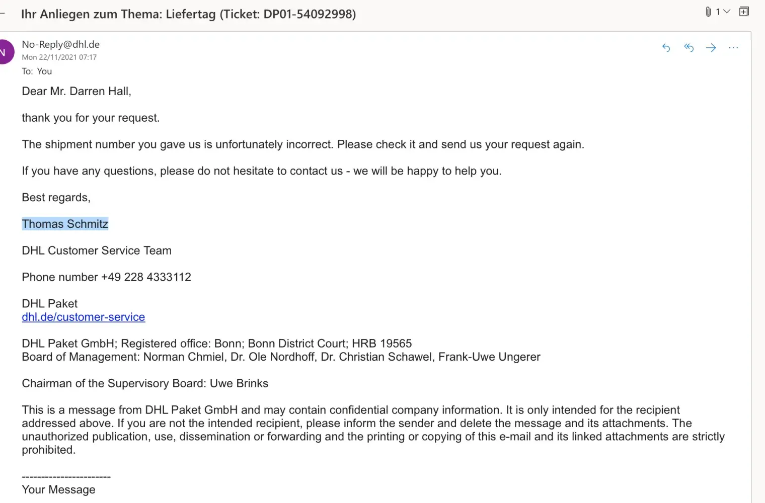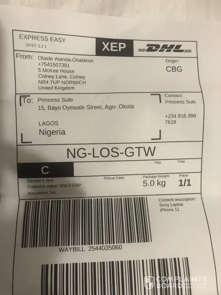 I was told they will investigate what happened in Nigeria and let me know what happened, however no one told me the outcome of such investigation. DHL Nigeria called the receiver to confirm if she received any delivery from DHL recently, which was weird as they reported in their system that the receiver received the package, so its fine. The receiver called to let them know that wasn't the case and asked them to update their system. It was disappointing to know that DHL UK and DHL Nigeria couldn't even communicate with each other, resulting in the receiver having to send an email to DHL UK to confirm my complaint.