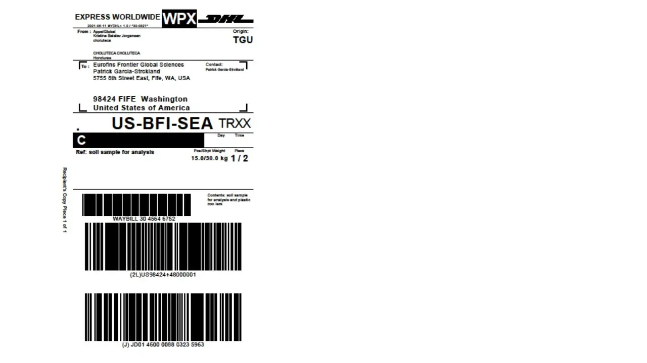 I refer to Way Bill # [protected], which was sent from Tegucigalpa, Honduras to Washington State in the USA. The package contained sediment samples that had to be refrigerated and they were packed with sealed icepacks.