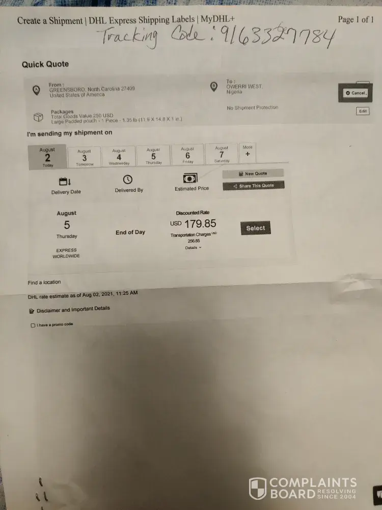 DHLECOMMERCE # [protected]. I want a refund. UG079303694YP is the order number from the seller, LC net. I have filed a complaint to Paypal already.
