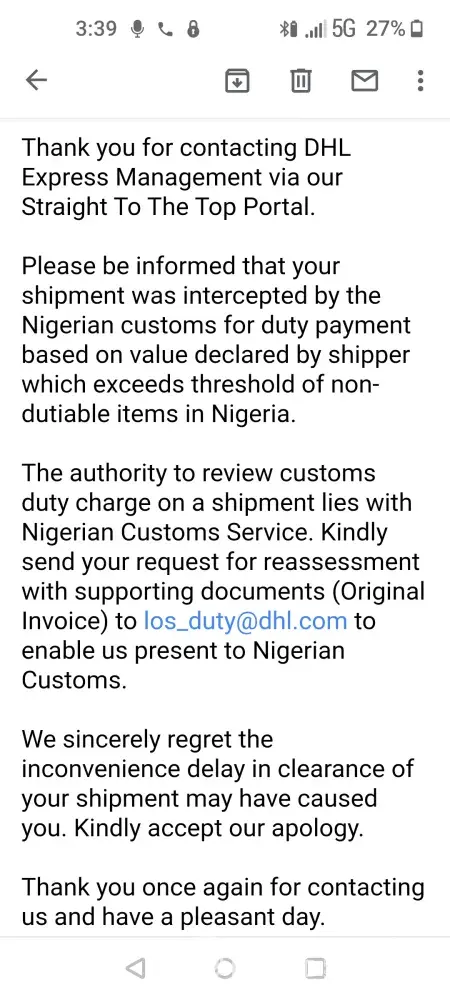 I sent a package as a gift, an LGV20 phone, a case and Wireless earbuds to a friend to give her means to contact her brother who is away from Nigeria, to let him know about the death of their Father. The phone was made in 2016. If the phone even break in her possession, she would have to throw it away, because they no longer have parts for that phone. The case for the phone is damaged very bad and it's not worth a single dime, and the earpiece is a very cheap store brand headset, that only cost $10. As God is my witness, she did not ask me for the package and neither was any money exchanged for it, I voluntarily sent it to her. DHL worker in Greensboro NC, is the one that valued the items based on an old Iphone that HE sold online. When he asked me the value, I said not much, he looked at it and said that he sold his phone online for $200. So I said ok and that's what we went with. Mind you, I know nothing about why a value was needed and he did not explain it. He did not say anything about a customs fee. I text them about this issue on chat, when the delivery update status changed to delivering a day later, from 8/5 to 8/6 due to being held in customs for an advance duty payment from customer. The person in the chat stated that customs don't charge a fee. This definitely was not discussed when I was paying shipping fees. If the DHL customer service representative would've told me this, when I was preparing to ship the items, I would have cancelled. This is wrong on many different levels. I was only trying to be a good Samaritan. This is so much stress and disappointment. After emailing Nigeria DHL complaint office via their website, I received non-existing phone numbers, along with an email address that came back as undeliverable.