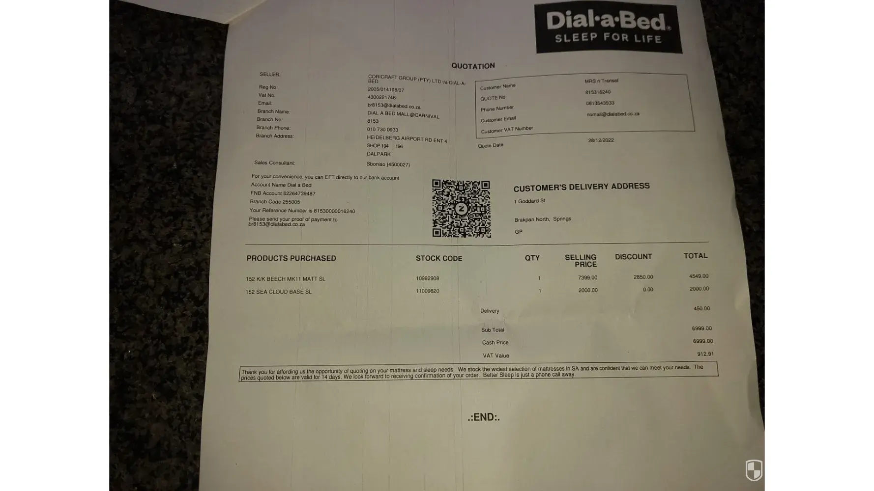 Bought a bed from dial a bed carnival mall on the 28/12/2022 with promis from sales person that it would be delivered the next day today is 30/12/2022 after many calls they are unaware what the next sales person is doing when asking question and note no paper track of purchase. Also no invoice received from shop as well only the quotain with slips that I...
