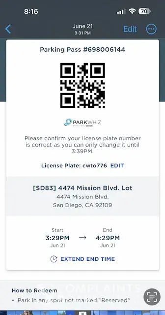 On 6/21/23 I parked at a Diamond Parking lot (SD83) and scanned the sign to pay. At 3:31pm I got a "success" notification and took a screenshot of it. I also received a Parking Pass #[protected] receipt with a start time of 3:29 to 4:29.