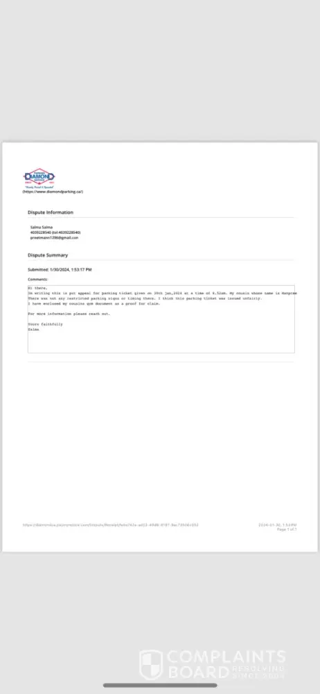 Absolutely horrendous company. Horrible customer ***. On Dec ***, my fiance and I parked at a spot in downtown ***, we paid for the spot and went about our evening. Came back within our timeframe, and conveniently we had a ticket from Diamond Parking Services. We immediately appealed the decision by supplying them with screenshots from the park whiz showing that the spot was purchased, that the spot was active at the time issuance of their 'ticket' and we sent the email and after Christmas passed we finally got a response. Their response was as follows: "A redacted bank statement or a screenshot of the transaction showing that payment has posted; it must list processed not processing. If a payment is pending we cannot accept it and will ask that you send the an additional screenshot once the payment has posted. You can black out any other sensitive and vital account information, as long as what shows is Diamond Parking." they did not acknowledge the screenshots of the park whiz app, but it doesn't constitute a void since park whiz did not list the license plate". So they pretty much said "Screenshot your bank statement and show us with some redactions." On Dec 29th, my fiance called Diamond and spoke with person with the company who acknowledged the receipt of the screenshots, but as the park whiz is a system they use they cannot accept it as proof. Yes you read that right, the proof that shows the active nature of the spot you rented is NOT PROOF, after a couple minutes of trying to get through to him, he said along the lines of "if you don't show financial statement, I cannot void this ticket and hung up on him. I agree with everyone else, ComplaintsBoard.com needs to investigate this company for shading business dealings and I caution everyone where you see "Diamond Parking Services" run don't walk away from their service. Currently in their appeal stages at the moment, and will update you.