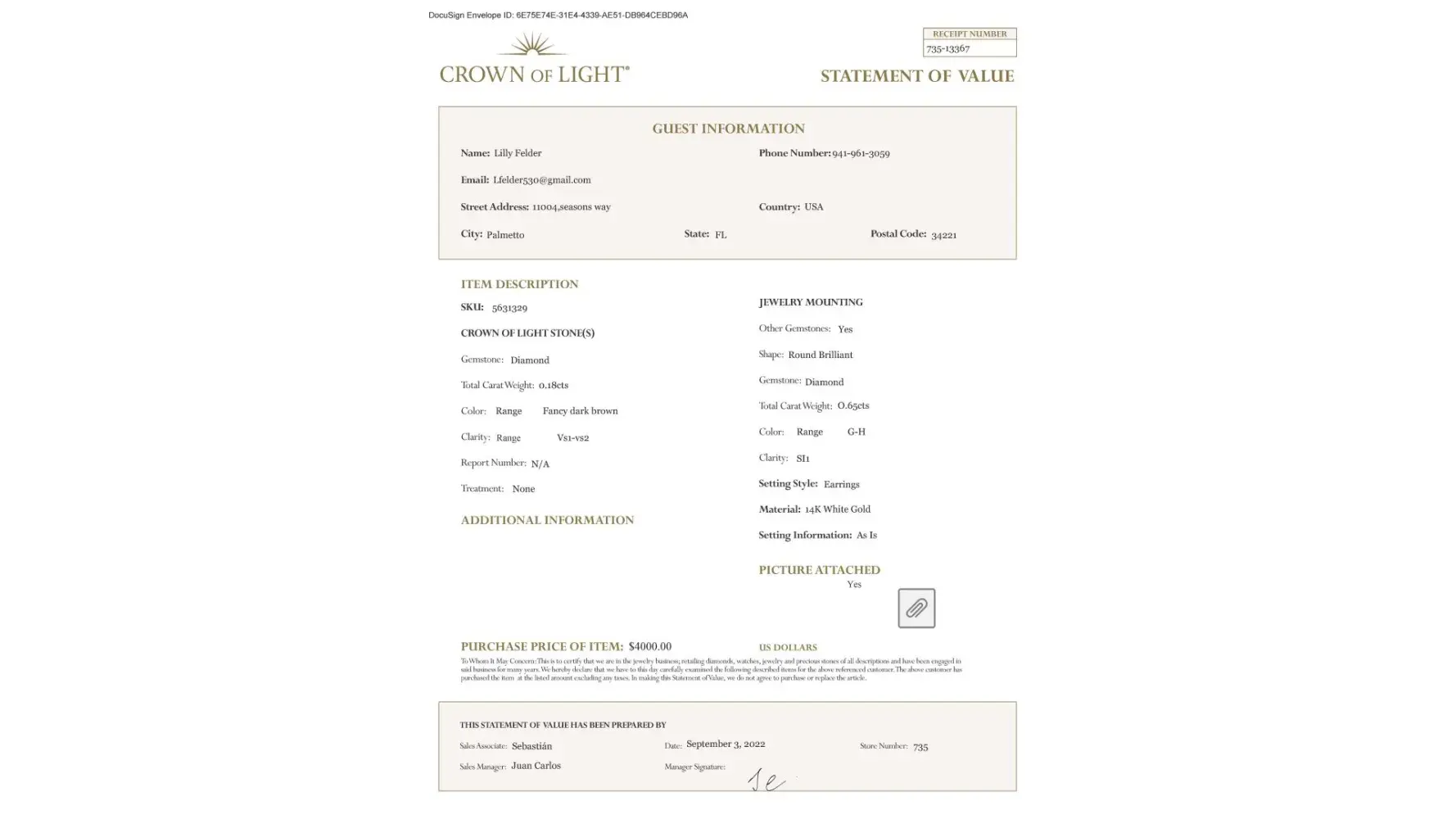 The receipt does not state the diamonds were brown in color, the statement of value however shows the diamonds are brown. If the salesman had given me this document at the time of purchase this matter would have be mute.