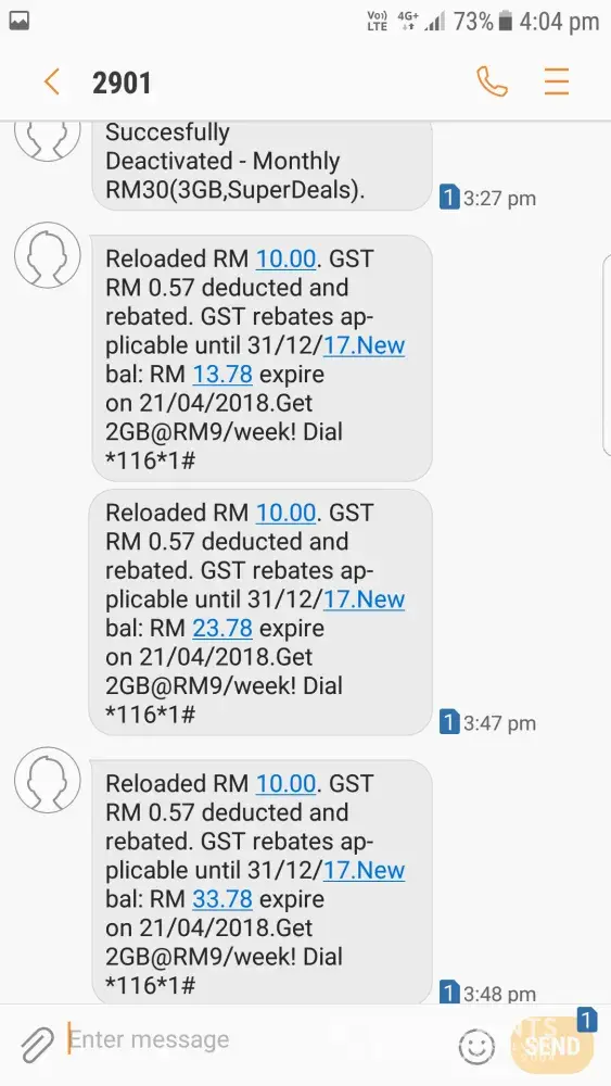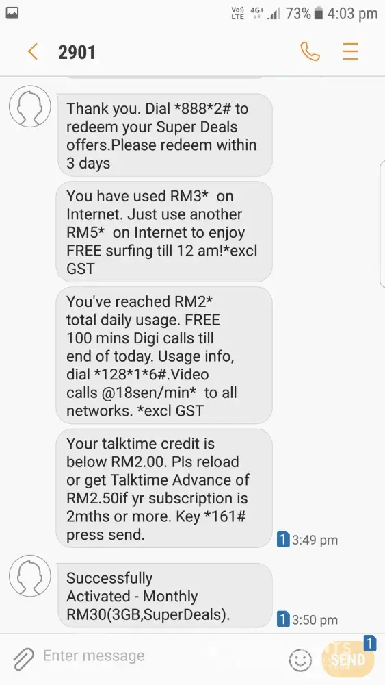I have been using digi for 10 years now. Have always avoided using mobile data ever since the bad experience of horrendous internet speed and unreasonable charges back in my hometown in sitiawan. 10 years later I am in seremban and am still using digi. Decided to give the mobile data another chance since the free internet I got from downloading mydigi app was pretty good. So, I subscribed for the 300mb mydigi app exclusive internet for 1 day. The quota remaining on the app screen went from 0 to 300mb and an sms came saying I have received 300mb internet so I went online to check on some urgent stuff. Lo and behold less than 30 seconds later, when I have just loaded a webpage two sms came within a span of 1 second saying that I have used rm2 and rm5 internet respectively. Great. 2 minutes later, another sms came saying 300mb internet had been activated. Another minute later an sms came saying I have reached rm8 internet usage and the rest is free for the day. What the hell... Within five minutes rm8 of my very limited credit flew out of the window. Hello, I know about the pay-as-you-use internet is for convenience but this does not apply to everyone. I don't need to spend rm8 per day on mobile data. Heck, I top up rm10 like once every two weeks, think i'm rich? How is this convenient? Digi mobile data has caused me inconvenience every single time I subscribed to its plans. There was this once where an sms from digi came saying something about my account has been credited with free internet and when I went to check it out (I just loaded the fb login page), it deducted rm4 from my account. Way to go. And this, shatters my trust on digi mobile data completely and needless to say I am not going to attempt it again. If it's not because my family uses digi (Mind you, they do not subscribe to the mobile data plans), I would have quit using digi a long time ago.