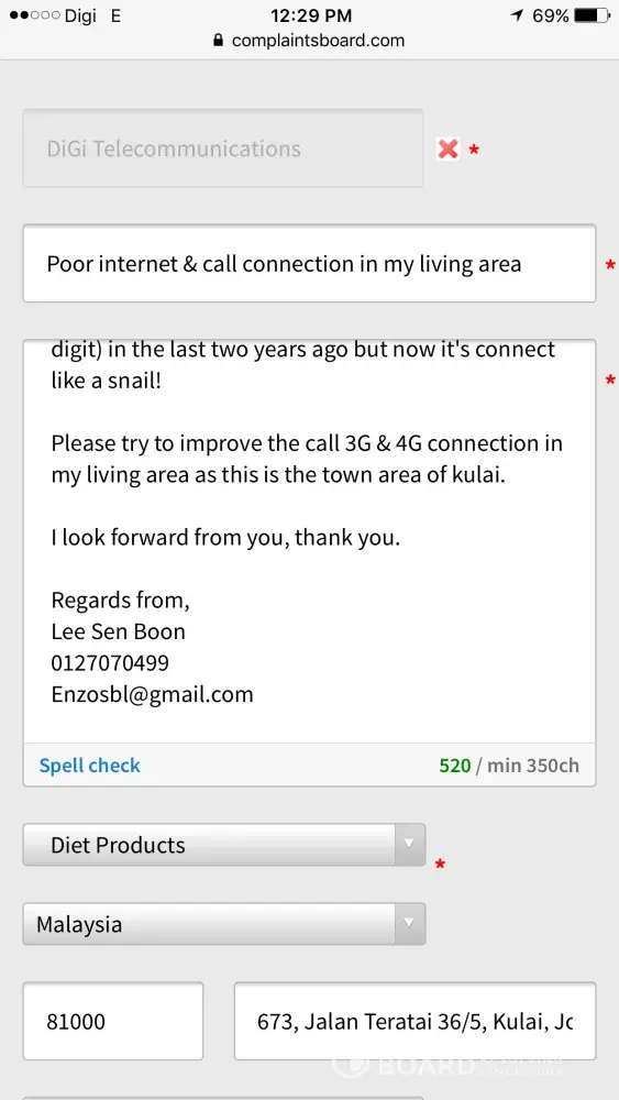 Assalamualaikum dan selamat pagi.. Disini saya ingin kemukakan kekurangan Digi Network di kawasan saya. Line yang tidak memuaskan dikawasan saya menyukarkan saya untuk membuat panggilan dan terima panggilan terutamanya jika berlaku kecemasan. Masalah ini sudah berlarutan selama 1 minggu. Saya sudah membuat laporan dengan Customer Service tetapi masih tiada dalam tindakan. Kawasan rumah saya ialah di Kampung Pasir Puteh, Merchang, 21610 Marang, Terengganu. Nombor telefon untuk rujukan ialah [protected] @ [protected]. Saya harap Digi dapat menyelesaikan masalah ini dengan secepat mungkin.