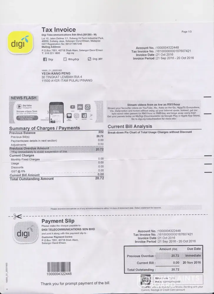 However, I am keeping receiving the bill that I have outstanding RM 20.72 found at my sub line Bill. Couple times, the representative of Digi called my sub line phone no in impolite way. Even he had threatened us that I have to pay the bill without any excuses.