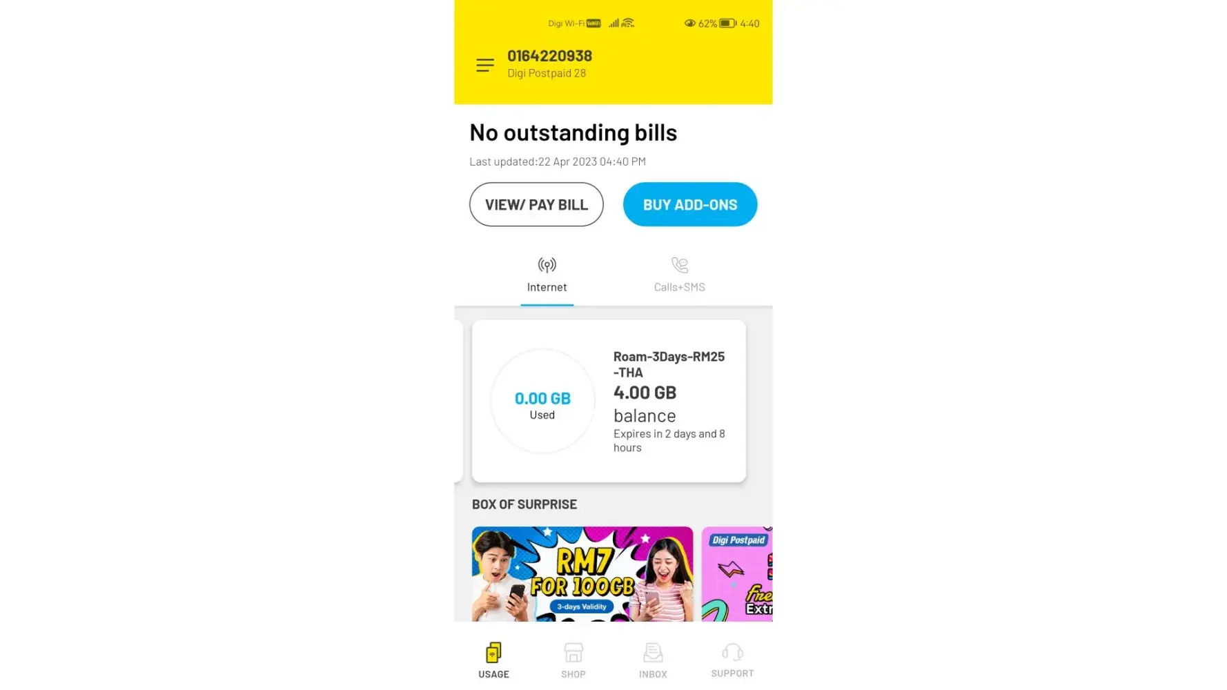 I am so disappointed by Digi services after facing those matters. I wish Digi could make consideration by looking back into my usage history as this would be fair to me. As well as some charges which I did not use but was imposed to my number could be compensated back by Digi.