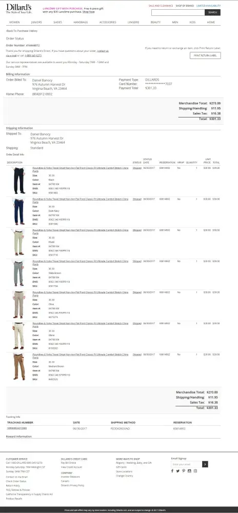 During the week of june 25, 2017, I purchased on-line 7 pairs of roundtree and yorke travel smart non-iron flat front classic fit ultimate comfort stretch chino pants. colors, item #s, and skus were as follows (see order [protected]):