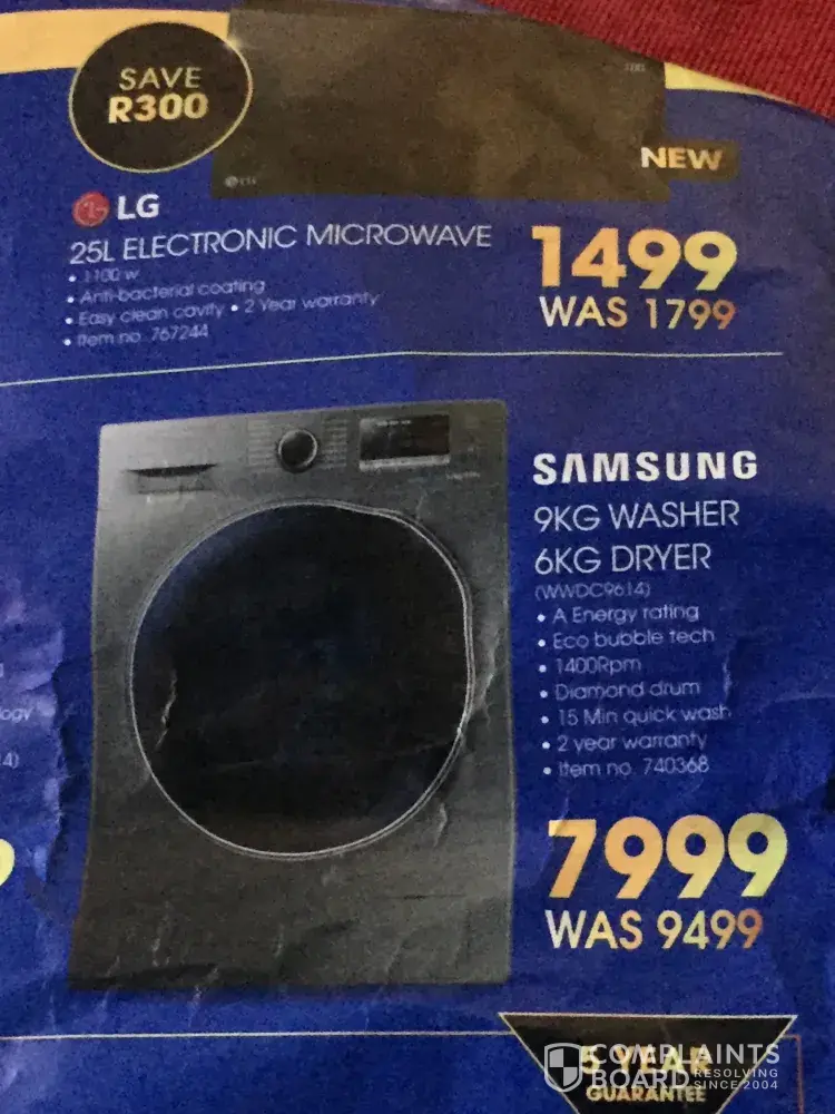 I am not happy with Dion wired due to their false advertising that they have posted in their pamphlet. Their stated that the full price of the Washing machine its R9499 and when I got to the their store on Saturday it was a different story since now the price it's R10 990 in store and they still would not allow me to buy it with the price I am seeing in their pamphlet. What kind of business are you guys running if you going to do a false advertisement? I am not happy client. I would rather take my business else where.