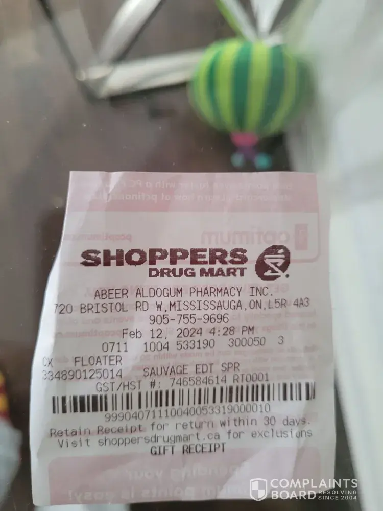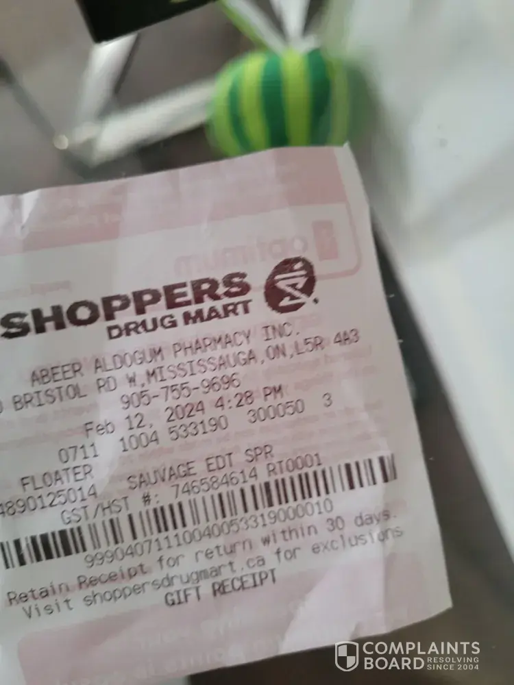 My birthday was on Feb 13. My friend gave me a perfume Dior Sauvage 100 ml gift with gift receipt. When I opened it, smell is not lasting at all (potentially defected). When I went to Shoppers Drug mart store - 1st of all they were very rude to me & 2ndly they said they can't do anything since it's open. I told them I just want to exchange it to the one which will last long. They said they can't do anything & call the manufacturer. When I called them they said they can't help & only shoppers drug mart can.