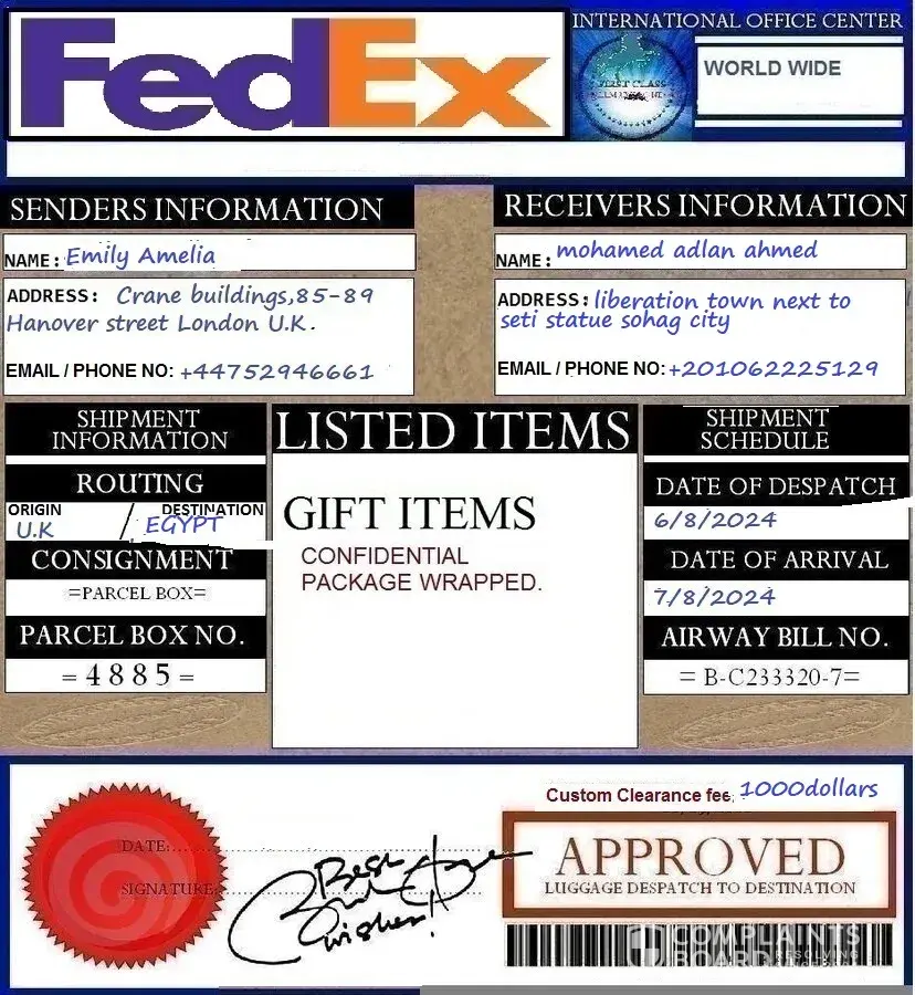 على احدى النساء قالت انها تعمل طبيبه و انها ارمله لرجل صاحب عقارات وشركات كبيره وانها ترفع قضيه على تم زوجها لانه يريد الاستيلاء على الميراث وانها تريد ان ادعو الله لها ان تكسب القضيه من عم زوجها ولقد تم انها كسبت القضيه وبعد ذلك قالت لى انها سوف ترسل لى حقيبه فيها هدايا تليفون ايفون ولاب توب و ساعه رولكس وملابس واحذيه ومجوهوات وعطور و 100 الف دولار وارسلت لى الايصال بتاع شركه الشحن وقالت لى ان شركه الشحن لها 1000 دولار أمريكي و فى الصباح اتصل عليا احدهم يقول لى انه يريد 25000 جنيه مصري مقابل مصاريف الشخن وكنت قبلها بالليل غرفت ان الموضوع احتيال من النت فلم ارسل له شئ قال لى ارسلها على محفظه فودافون