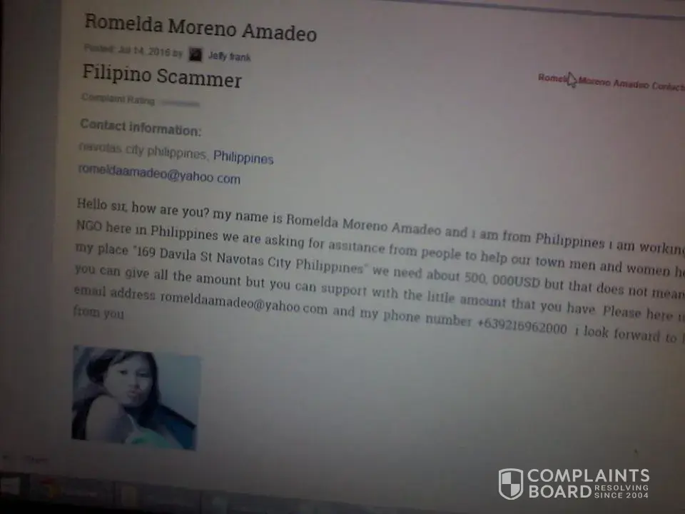Im Romelda Moreno Amadeo im a dog breeders not a NGO and I dont know what NGO means but Musa ABdul made a story to about me and he said im scamer..you know who is scamer you and your wind cargo courier..you know im not good in english and grammar that why you make me a story like im very smart..