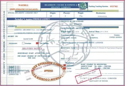 Darling, I have sent the luggage to you before I traveled and the items i bought for you is as follows, 2 i phones for me and you, set of jeweling silver color, TWO PACK OF NEW HP LAPTOP, all together with the money in the box 750, Thousand pounds that we will use to buy our house when i come, please do not tell anybody that their is money inside the box to avoid thieves and I cannot send such huge amount of money outside my country with bank that is why I decided to put the money in that luggage .Above all, the things i will use when i come is inside the pack as well, such as my cloths, shoes, and my wrist watches, please keep everything intact, and i send all this because of the trust and love we have for each other.baby i will contact you once i get to Sudan .moreover honey the courier where i sent the luggage brought to my notice that a total sum of £950 should be paid for a clearance charges of the luggage in Asia branch indonesia and i would have made the payment here in my country but the courier told me that the payment is not done here in my country that it is done once the luggage get to Asia branch, Indonesia.please honey i will like you to help me with the payment of the money once the luggage gets to you, you will take your money back from the box the code number of the luggage is 401.