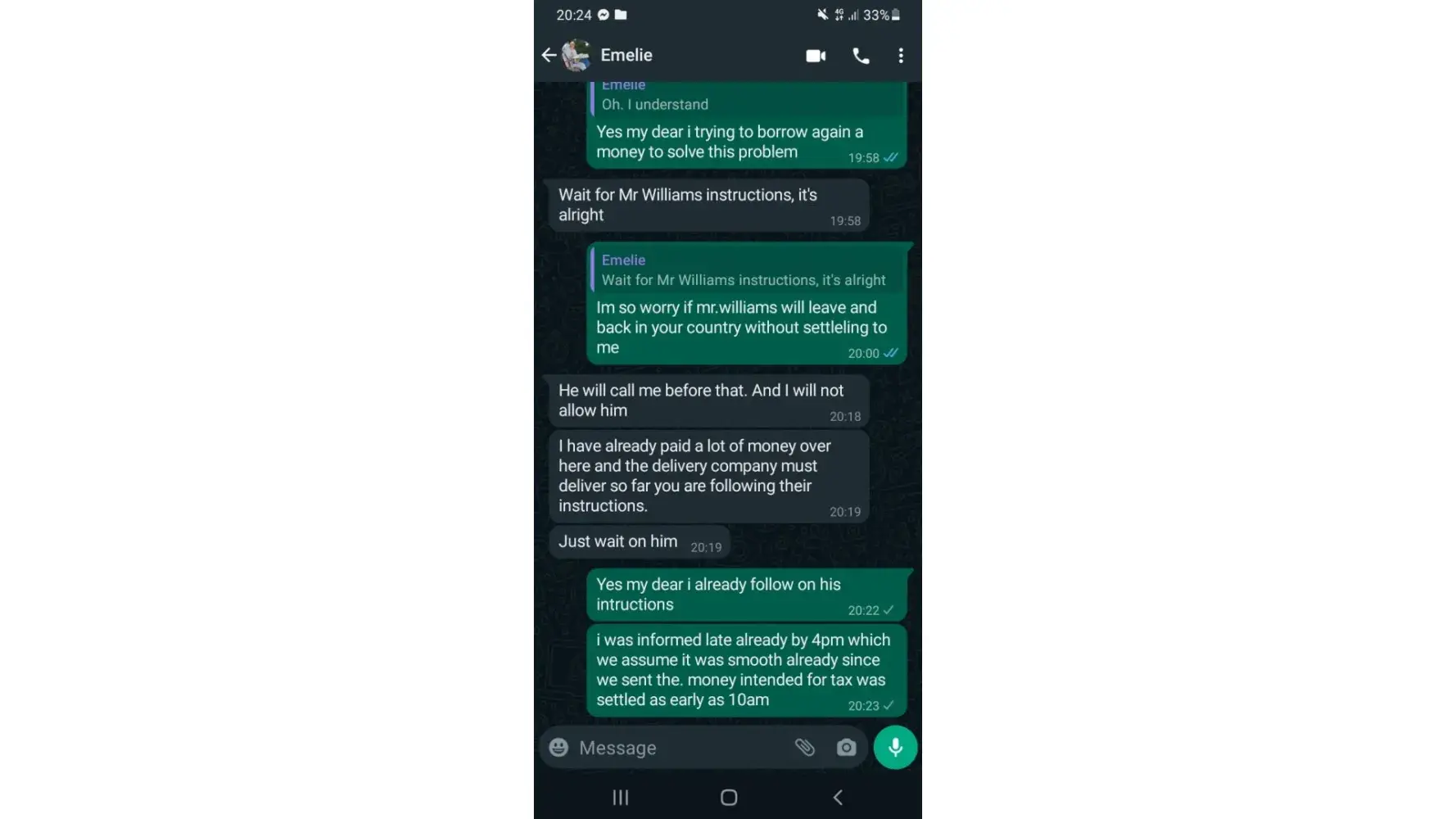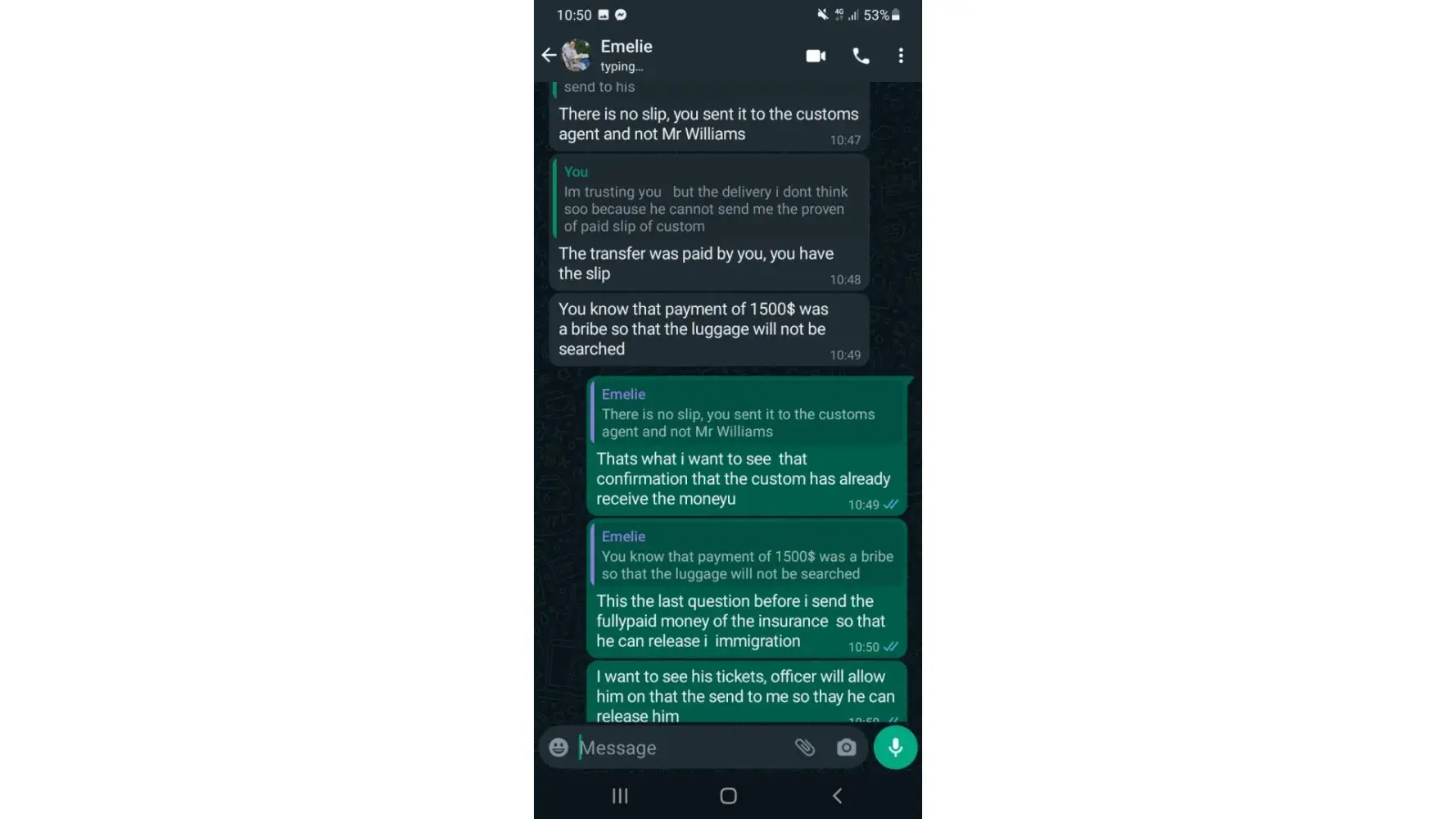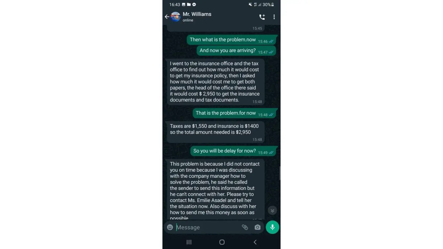 THIS IS THE ONE PERSON WHO SCAM MY MONEY I LOST 1550$ because i need to pay for the taxes to recieve the luggage after he recieve after 6 hours he said i need to pay additional for the insurance that is the reason, thats make me to think. Mr.Williams Peters is the delivery man and the sender is EMELIE ASADEL i have a lot of evidence here.