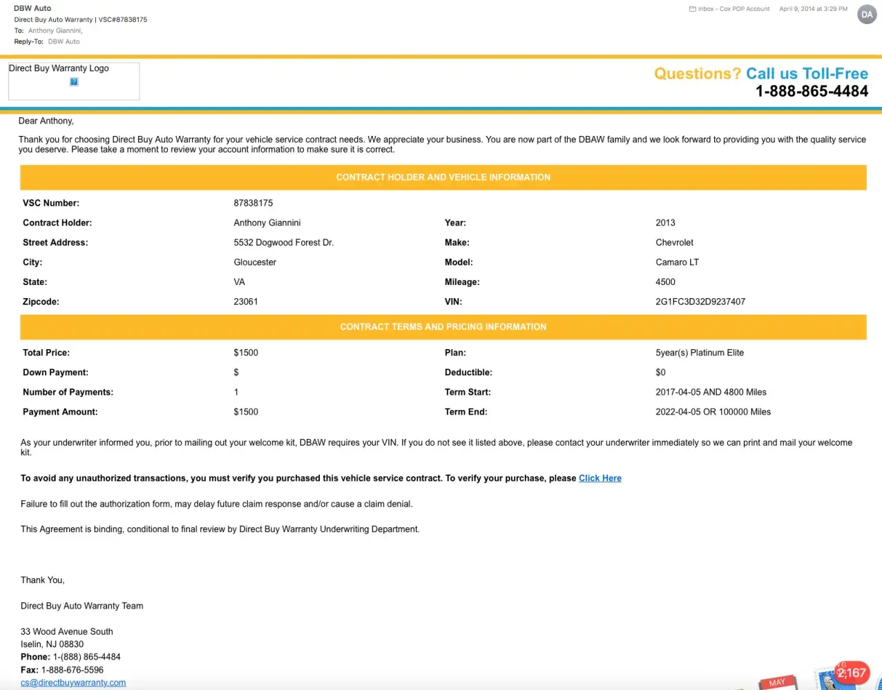 3. Direct Buy Warranty emails