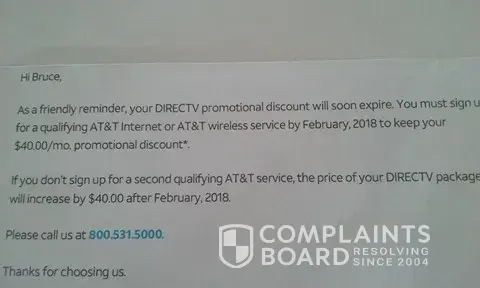 Signed up last March for Directv, we had Dish and was still on contract with Dish for 6 more months. Was offered a $200 gift card to pay off Dish . Never got card . And then today I received a letter stating that if I didn't switch to a AT&T cell service or internet that they were going to charge me $40 per month . I pay $100 per month now just with basic channels ( no movies, hunting, sports ). Nothing was said to us when we signed up for this. At&t cell service DOES not work in my area . I had it for 10 years and now to old to stand outside in middle of yard to make a call especially when it's only 10 degrees out. They didn't leave and contract with us or even a how to use booklet. I called today and after 30 minutes on phone with someone I could not understand and he didn't know what I was talking about . I told him point blank that if they uped my bill $40 that I will cancel my autopay and they had 2 days to get their crap out of my house. Enclosed is letter we received