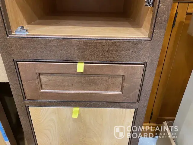 Bought Fieldstone cabinets thru Directbuy, due to poor workmanship and little or no quality check prior to cabinets being sent out, I had stain runs and chips/scratches. Fieldstone and Directnbuy sent pieces and expect me to be a master cabinet builder to remove and replace mounting boards/cabinet hinges myself. Also, their replacement parts are a different shade of stain so the cabinets are two tone in color