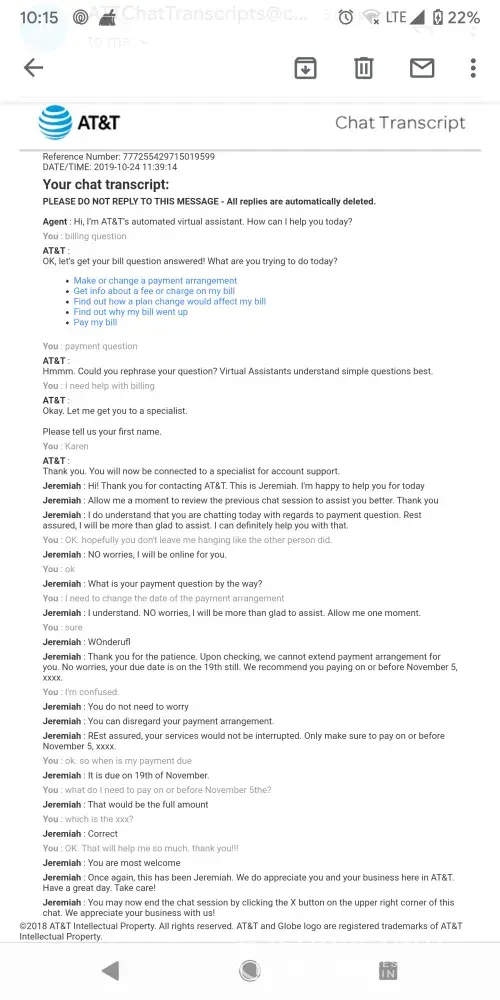Attached is the chat transcript that I had with a account support specialist on October 24 2019. Wanted to make a change to my previous payment arrangement. Per Jeremiah. He was not able to make any changes but said not to worry. He said to disregard my payment arrangement and rest assured that my services would not be interrupted and just to make sure to make a payment on or before November 5th. This morning my services have been interrupted after a promote was made that it wouldn't. I have talked to 7 different people at direct TV, 2 of them supervisors. None of them would honor that documentation that I had. I was lied to and a promise had been broken to me even though I have proof of that promise. 2 of the Supervisors, one was named Jelly, she was rude and not helpful at all. She was not listening to me. Something needs to be done. I will take this all the way to corporate and beyond if I have to.