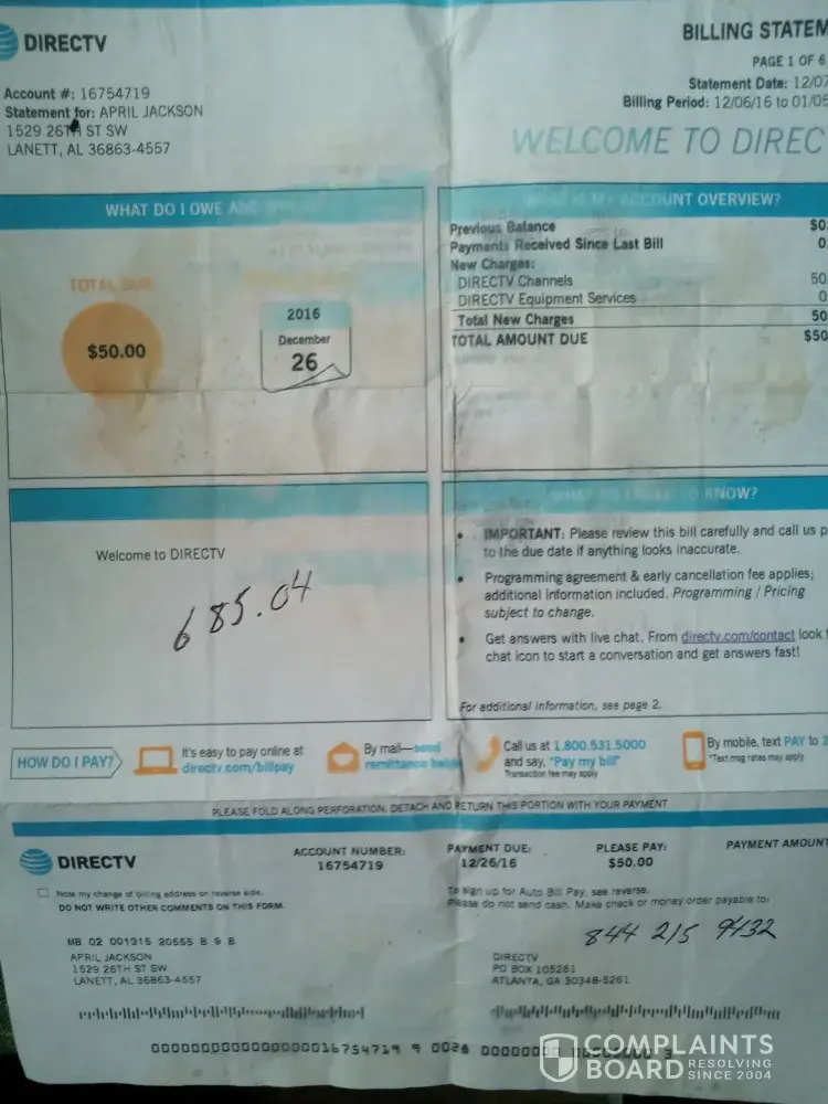 Moved out may 2016 transfer service to someone else they did not pay and direct tv charged my debit card when the person did not pay. Sued in small claims and won today. Need a class action they never had the authorization to hold my card information and me for someone else account who was financially responsible. Because of their actions, I had to close my checking account and destroyed the debt cardit. Had checks that were written bounced and received three days notices all because of DirecTV had no authorization to hold on to my account information.