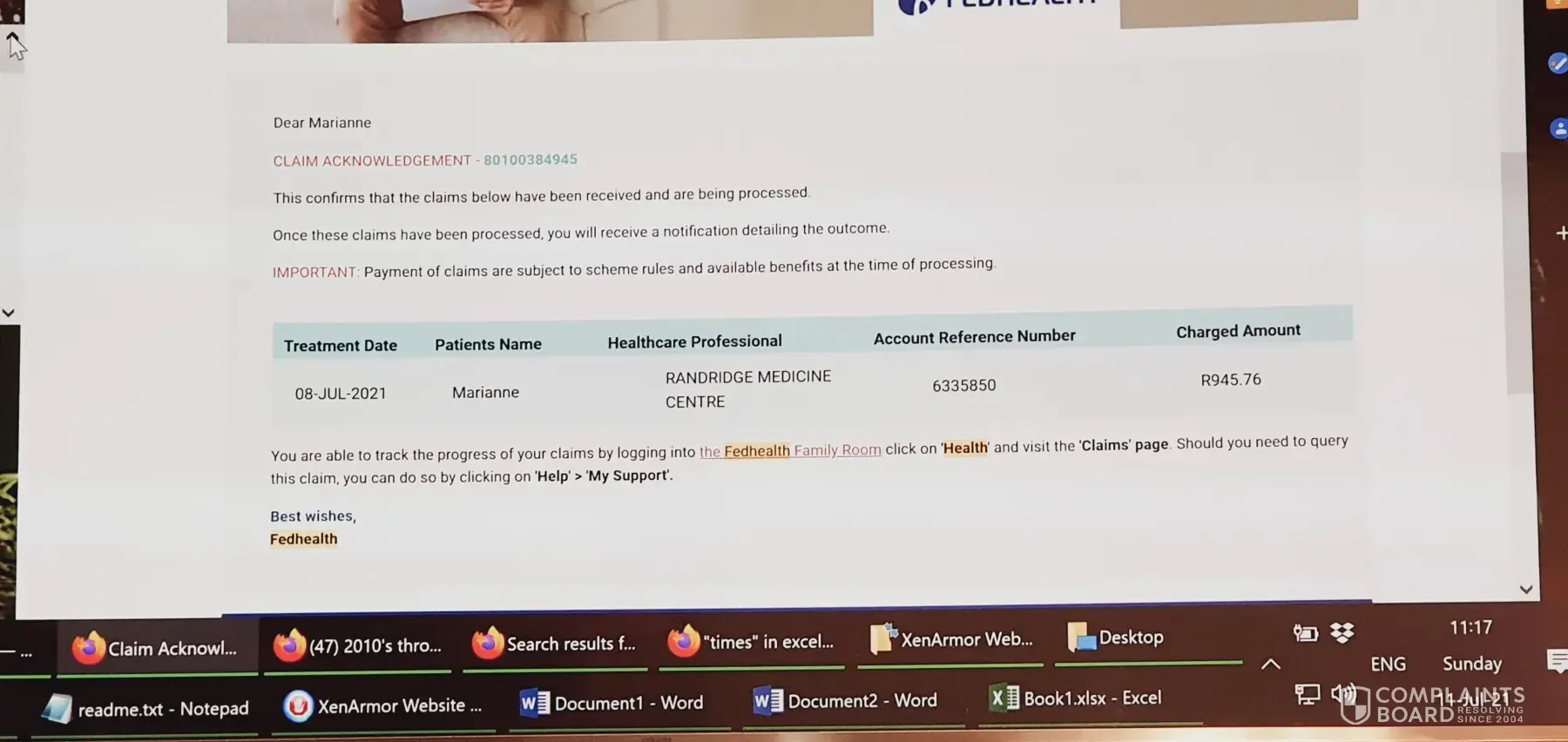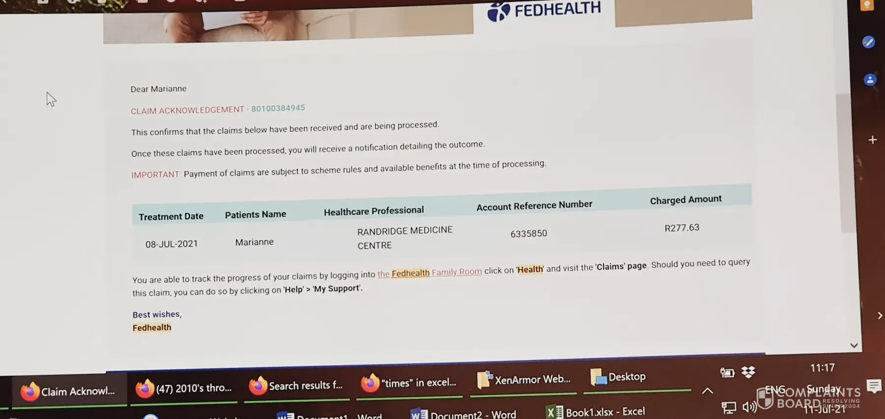 Desired outcome: Firstly I would like a definite answer on this complaint. If my husband does become more ill Ill expect you to carry the costs and I would like my R350 back