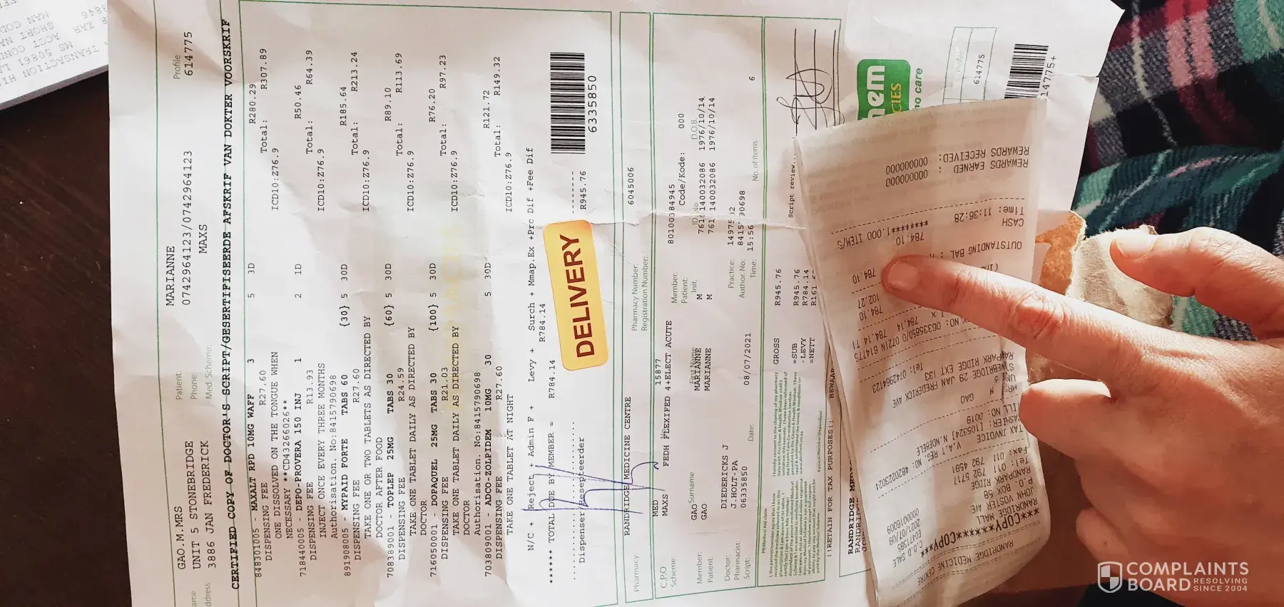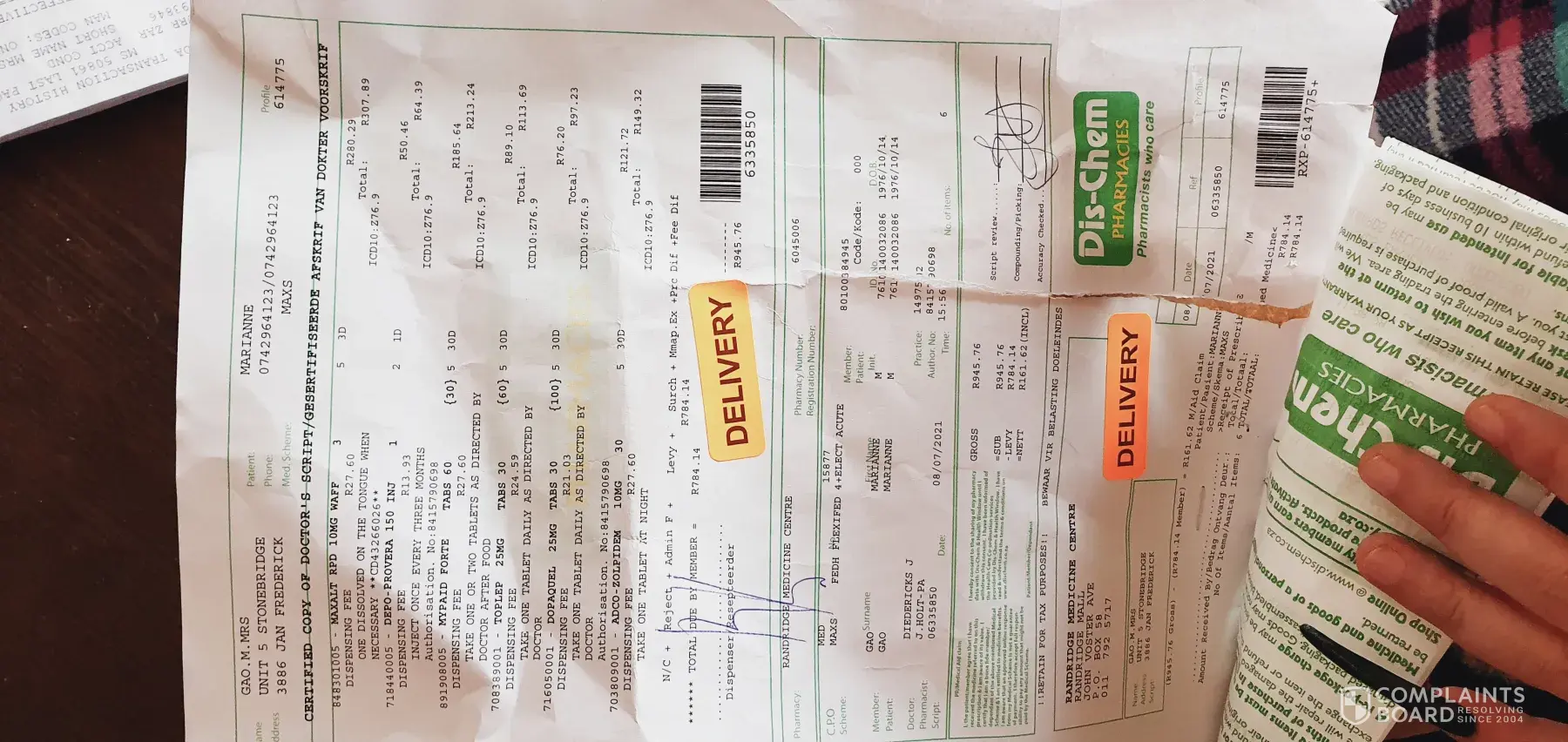 None of what i ordered was in the order he delivered to me. Instead of the items that i ordered in my email, the staff at RandRidge Mall DisChem sent me everything on the prescription i attached to prove that i have a prescription for my DEPO injection. This has now cost me 2 days without my injection and i had to pay R784.10 for something i did NOT order!
