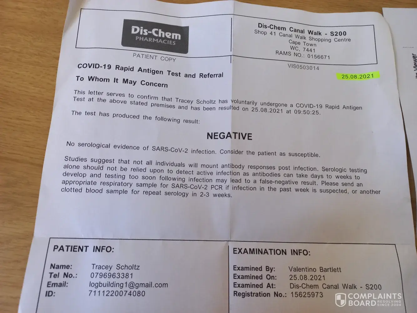 On wednesday the 25th of august I had a covid test at century city dischem. I am a monkeynastix instructor and work with more than 150 children at different locations every week. As I was not feeling well, and not wanting to endanger the children I decided to go for a covid test with money I did not have as my husband lost his job last year. I was tested and told I am negative. My husband was waiting for my result as he had to go for his second vaccination which he obviously did as apparently I was negative.