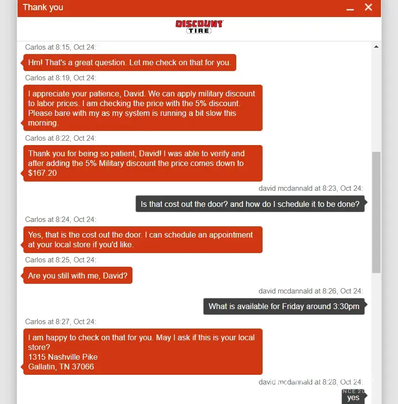 I set up my appointment to have 4 new tires mounted and balanced with the lifetime. I was given an out the door price. See below. Well Friday as I was explaining this to the employee a guy in a red shirt said that's too low and that he would charge me more since they were my tires not from discount. Which that was very rude. Well, another red shirt think Conner was name helped him and got within 20 cents, but this was not the lifetime which is what I thought to be getting. Needless to say, I have bought plenty of tires at Discount I have 3 vehicles I now am wondering do I need to go to a much better customer service place.