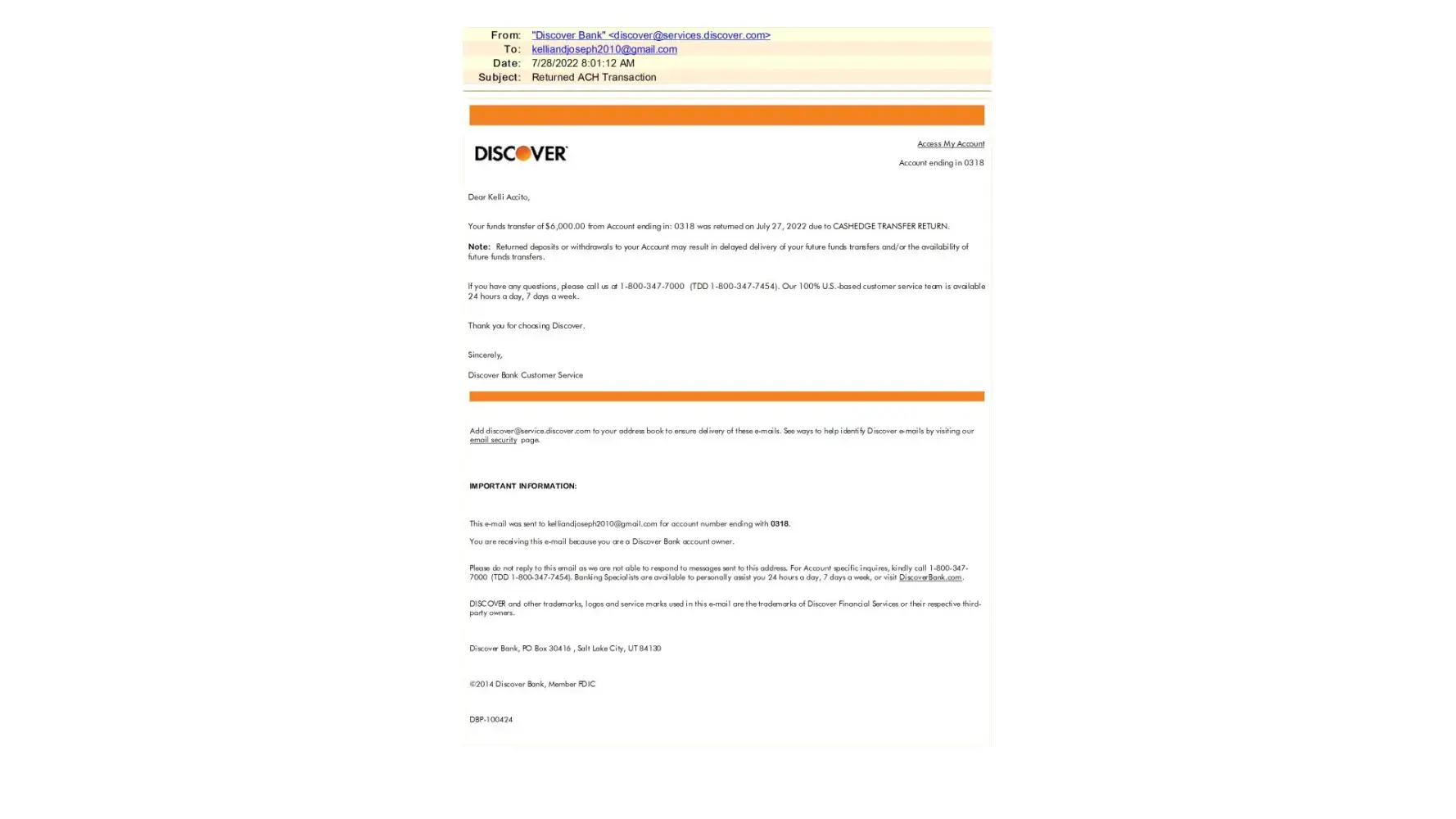 Discover Bank / Discover Financial Services Unrefunded deposit