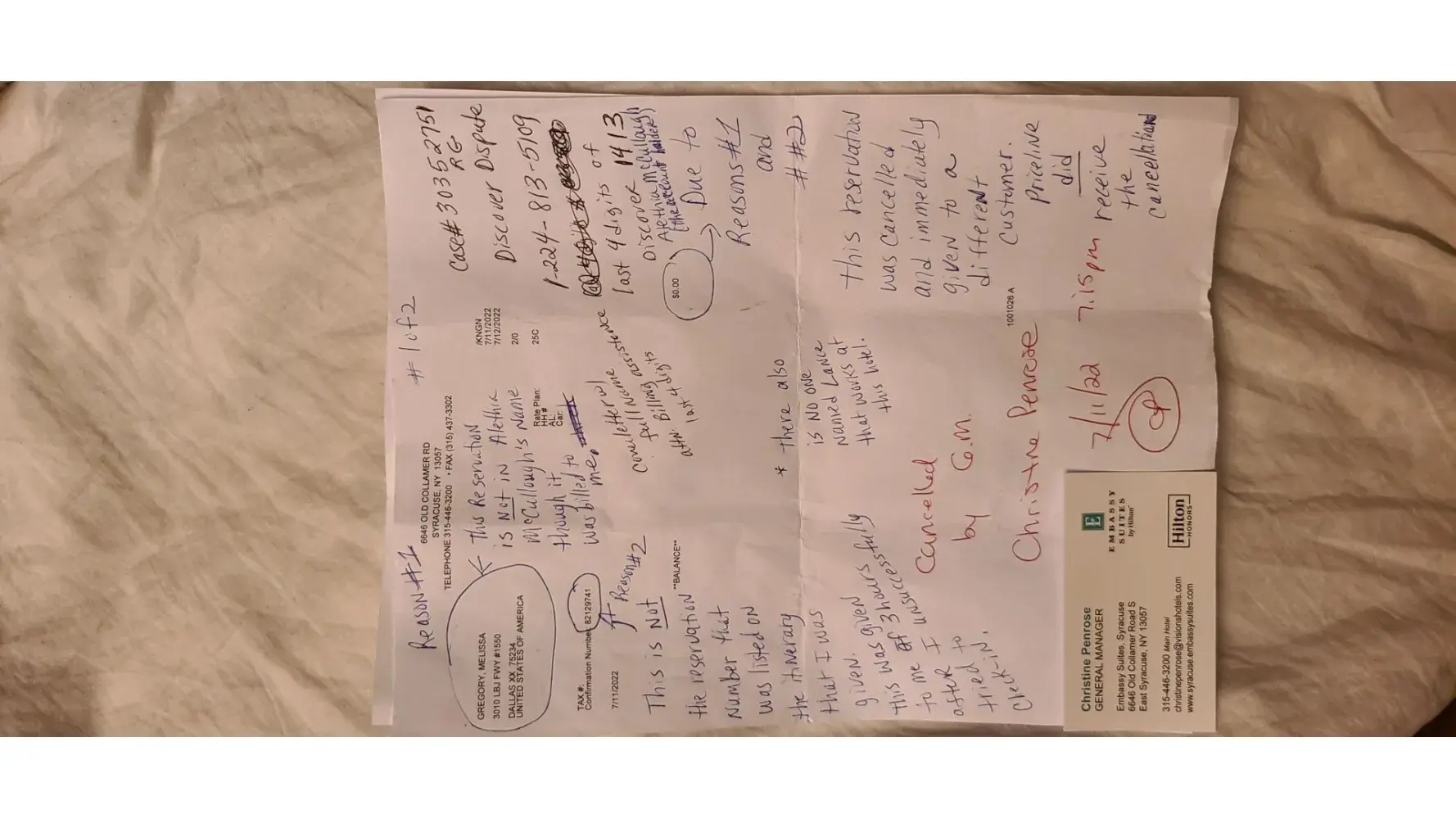 I paid in advance for a non-refundable hotel room through Priceline.com. However, after arriving, there were problems with the reservation and Priceline refused to speak to the hotel and would not talk to me until it was resolved. Priceline also lied and claimed that they spoke to an employee named Lanz-FD when no such person has ever worked for the Embassy Suites hotel on Collamer Road in Syracuse, NY. Therefore, Embassy Suites cancelled reservation #[protected] and did not charge me anything, then they sold that room to someone else immediately. I submitted a computer generated receipt, from the hotel, with the general manager, Christine Penrose's signature, verifying that this reservation was cancelled, with handwritten notes by me that explained the errors to Discover because their agent said that I can't be charged for a service that I did not receive and my receipt would be proof. However, after receiving the receipt, Discover said it was a handwritten receipt and that I needed something typed on Embassy Suites letterhead. Then, Discover reversed the charges, forcing me to pay for hotel that I never received. Thus, I asked the hotel for a letter on their letterhead, which they wrote, only to have a Discover Dispute Supervisor tell me on my 4th call that my documentation that I never received this hotel room does not matter. The Discover Dispute Supervisor said that the only way that I would get a refund is if Priceline agreed to refund my money. I told her that Discover was violating Consumer Protection law. However, the Discover Dispute Supervisor said that as long as the merchant said "non-refundable" at the time of purchase, then Discover would make its customers pay.