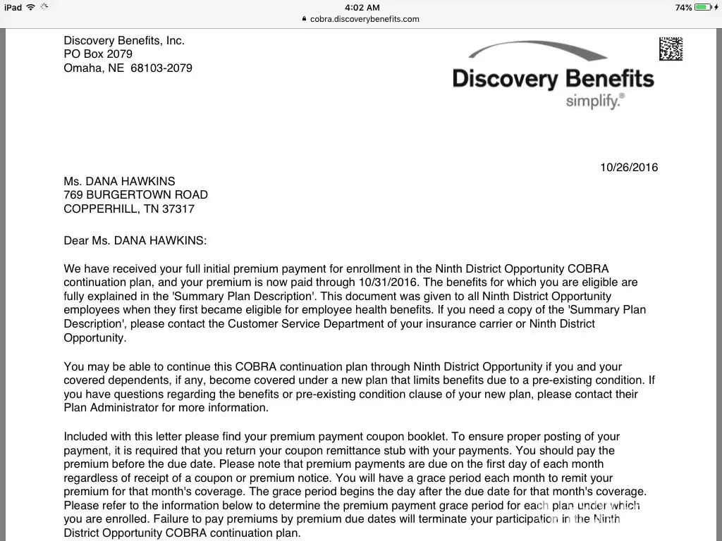 STAY AWAY! Same story as everybody else: they have been taking my premiums for SIX month and have yet to forward my enrollment to the insurance company. Cobra is administered by THREE federal agencies: the U.S. Department of Labor [protected], the Centers for Medicare and Medicaid Services (877) 267.2323 x61565, and the IRS [protected]. I have medical accounts going into collection because of their ineptitude, so I am suing them in small court under the FCRA. Texas small claims court limit is $10K, and it's an easy DIY process. DiscoveryBenefits messed with the wrong person!