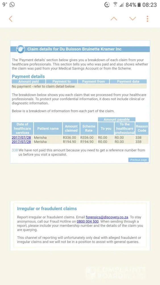 Good morning .My name is merisha from ermelo. On the afternoon of the 25th july I noticed little bumps on my whole face wich where very itchy.So I went to my local pharmacy they gave me celestimine tablets and viocort ointment and said I have an skin allergy. Went home took the meds as prescribed applied the ointment.The morning of Friday 28th july no difference on my SKIN it was still very itchy and still all over my face .I then tried calling many dermatologists most of them only had appointments for me late August, middle september wich to me was impossible as I was suffering there n then for 3days taking meds n applying an ointment wich never made any difference.I called Dr Karen coch rooms she gave me an appointment for Friday 28th july at 16:00 wich I took the appointment as I'm worried what is happening to my face.I saw dr coch wich she said it looked like i had eitjer a bacterial or fungal infection on my FACE and that she had to take skin sample from my dace to send to the lab for testing to find out exactly whats wrong with my face.Today 11th AUGUST I receive an email from discovery claims stating my phatology account will not be paid as I needed a doctor's reference letter in order to see a specialist.what upsets me is that when you are faced with a situation what do you do?I for a fact know that if I went to the doctor I would have only seen a dermatologist within 2weeks of seeing the doctor. Who in their right mind will wait 1week or 2weeks to see a specialist when I was suffering with my skin so bad.its so sad that I am forced to have a useless medical aid like discovery, majority of the time i pay cash for a Lot of medication.When you have a problem why must we always wait, if I have a problem I want to been seen then there not when it suites a specialist.its sad doctor's and specialists are only in this medical field to make money it's not a passion and to help but it's us the patients have to be at there beck n call.You discovery need to review your do's and dont's when it comes to clients having a problem and need help ASAP.Very disappointing.I have a medical aid that I will go a year with out using any funds but the time i have a problem I still have to pay from my pocket.
