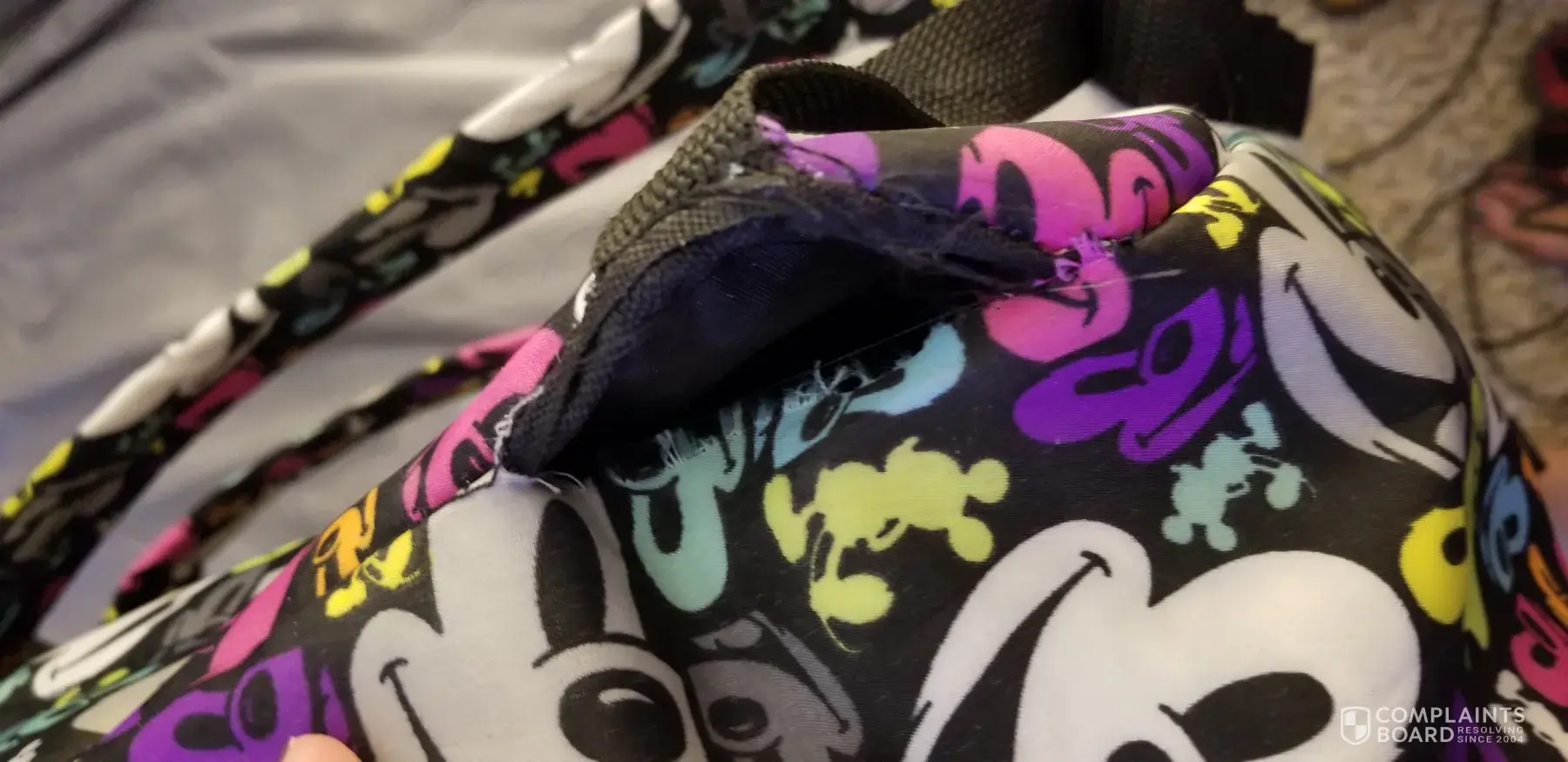 I purchased my Disney back pack at Disney World Orlando in April 2018 it is the back pack with mickey in multiple colors and it has torn on the seam where the lower strap connects to the back pack. I really love this back pack and use it often, very disappointed it has torn already. I would really like my back pack replaced please. Please let me know what other information you need to assist in this process. Thank you.