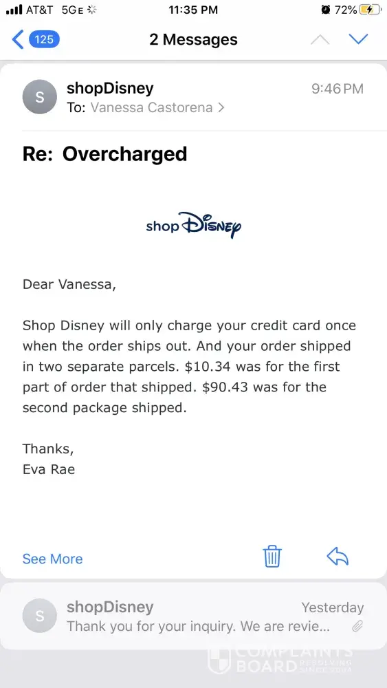 I submitted a concern for being overcharged by email to customer service on 12/8/19 10:36pm. I received 2 charges on my card $10.34+$90.43 = $100.77. My order total was $98.53 per my email confirmation. Attached is the response I received from my email to customer service along with copy's of my email confirmation and credit card transactions. Please resolve this matter
