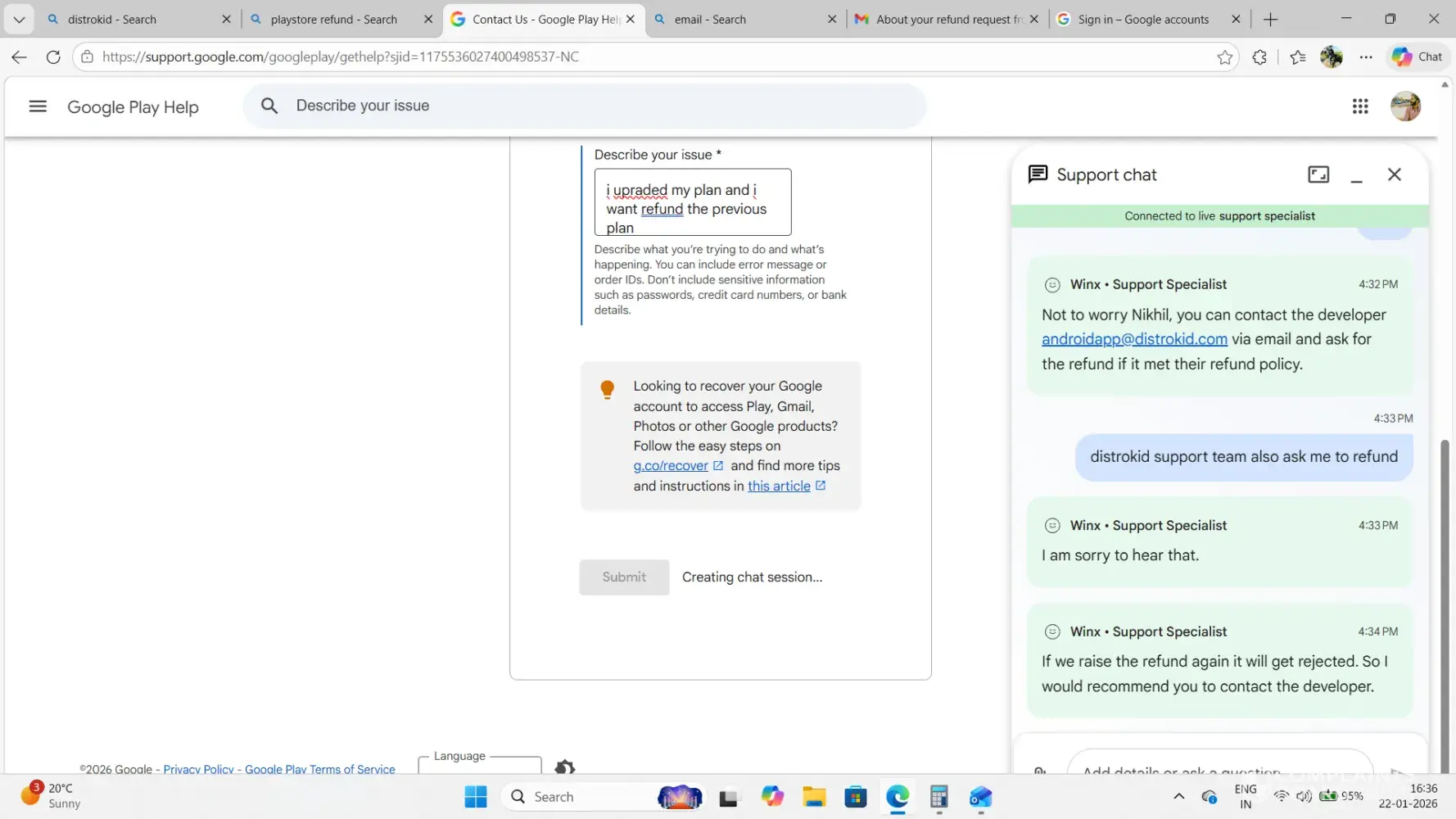 Hi DistroKid Support, I originally subscribed to the Musician plan ($24.99/year) on January 10, 2026. On January 22, 2026, I upgraded to Musician Plus ($49.99/year) following advice from your support agent (named Jia and others). The agents told me to cancel the previous Musician subscription in Google Play and request a refund there, which I did. Google...