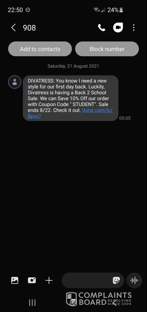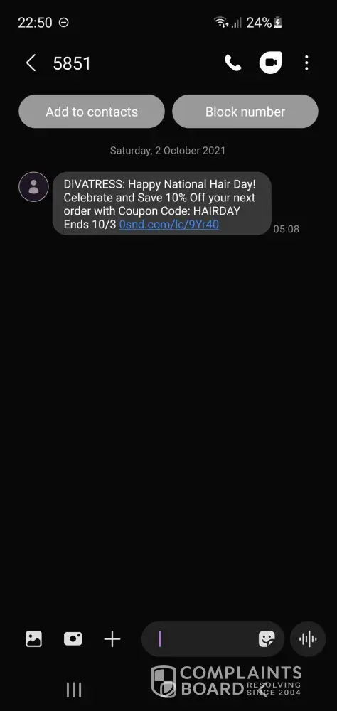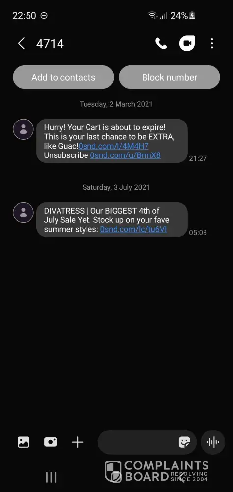 I have never purchased from Divatress but they have kept my phone number on file and continued to contact me to make purchases when I never consented to this. It's likely they will have my personal phone number from when I would have attempted to place an order but once they stated they couldn't ship to my address I couldn't finalize that order and completely exited from their website.
