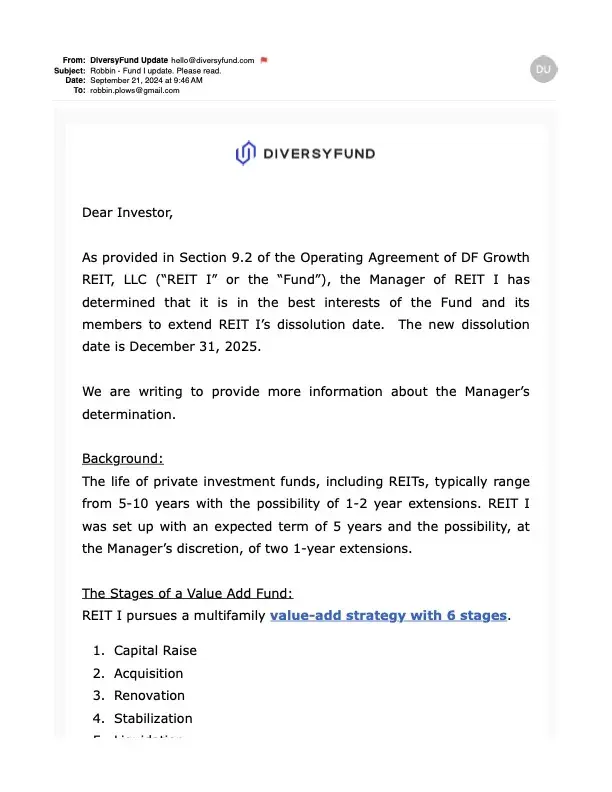 I have been an investor for several years. Diversyfund has been a good company to work with. They provide updates and even if the news is negative there is no sugar coating. I get the feeling some people didn’t realize that the investments offered by Diversyfund do take time not like a stock that may do a 2x in 6 months. The investment was explained to me before I invested
